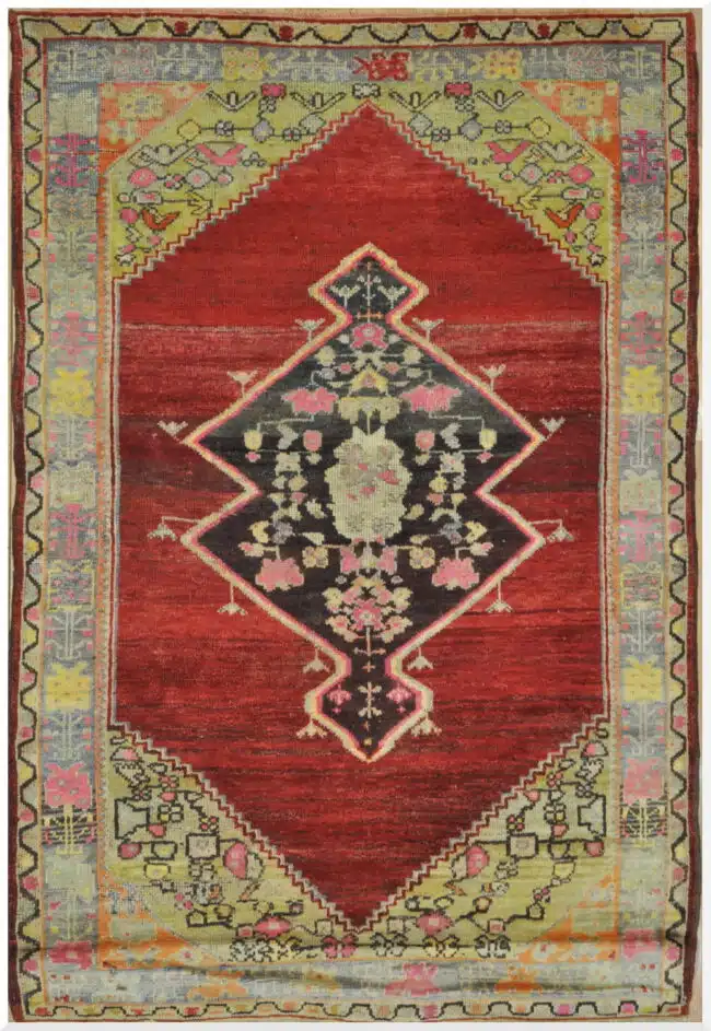 This Turkish tribal rug features a bold red field anchored by a striking central stepped medallion, a classic motif found in Anatolian village weaving. The strong geometric composition is balanced by softly patterned corner spandrels and a decorative border filled with symbolic floral and tribal elements.