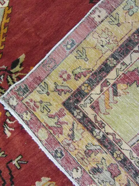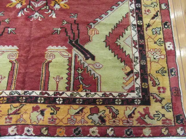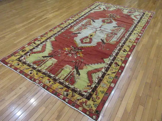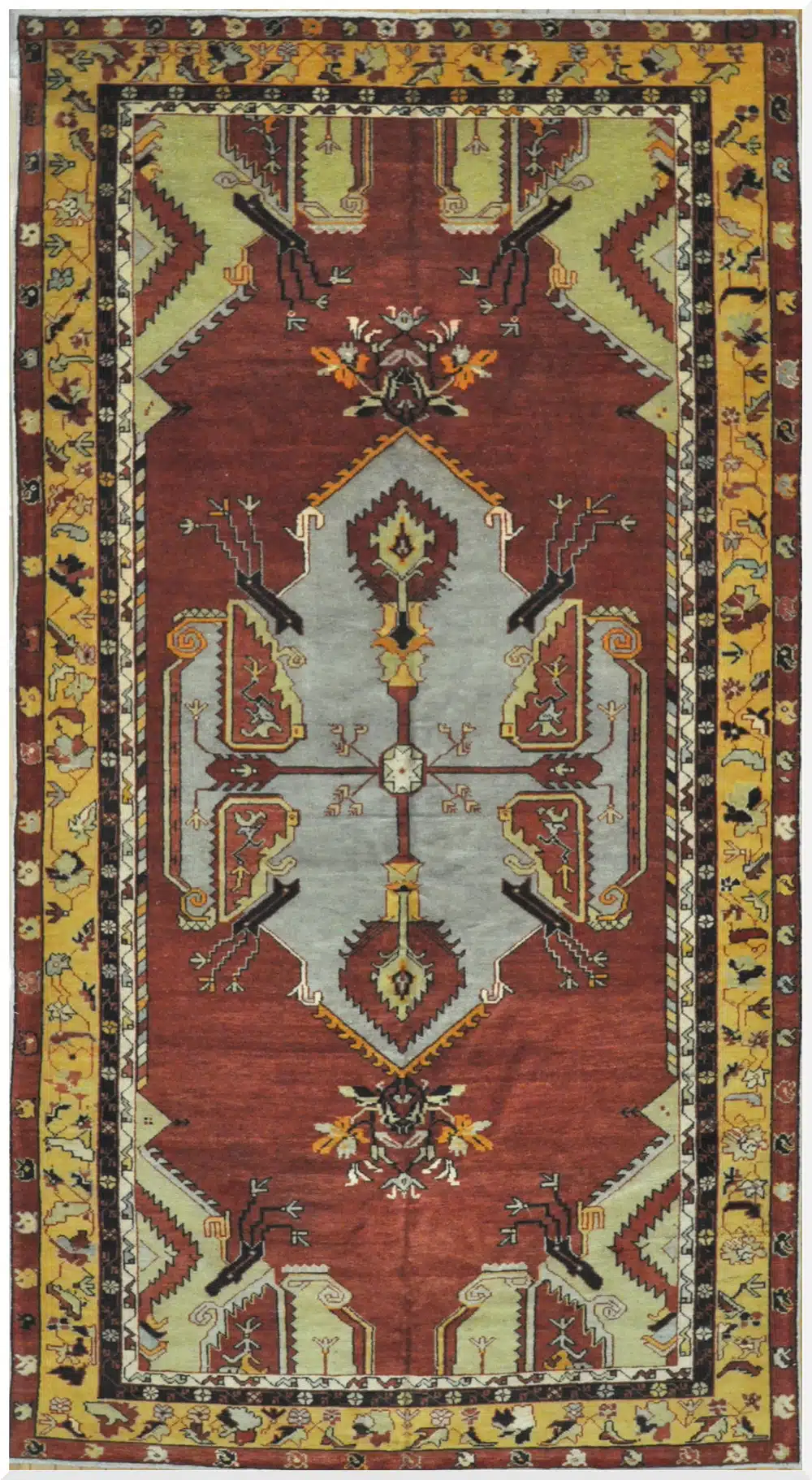 The rich rust-red field is contrasted with a soft ivory medallion, accented by golden yellow and charcoal details that add depth and definition. Natural dyes have aged beautifully, creating a warm patina that enhances the rug’s authenticity and character.