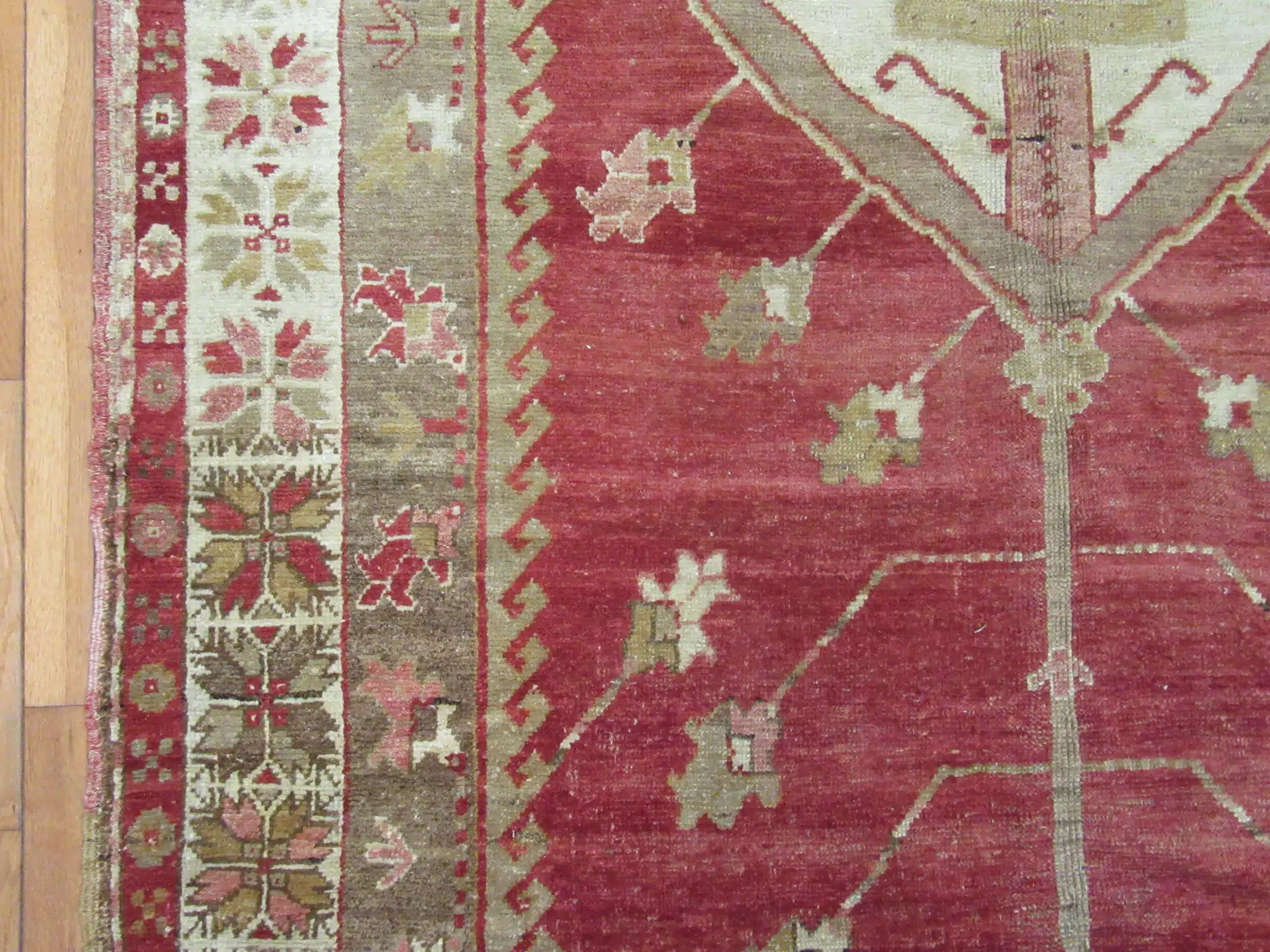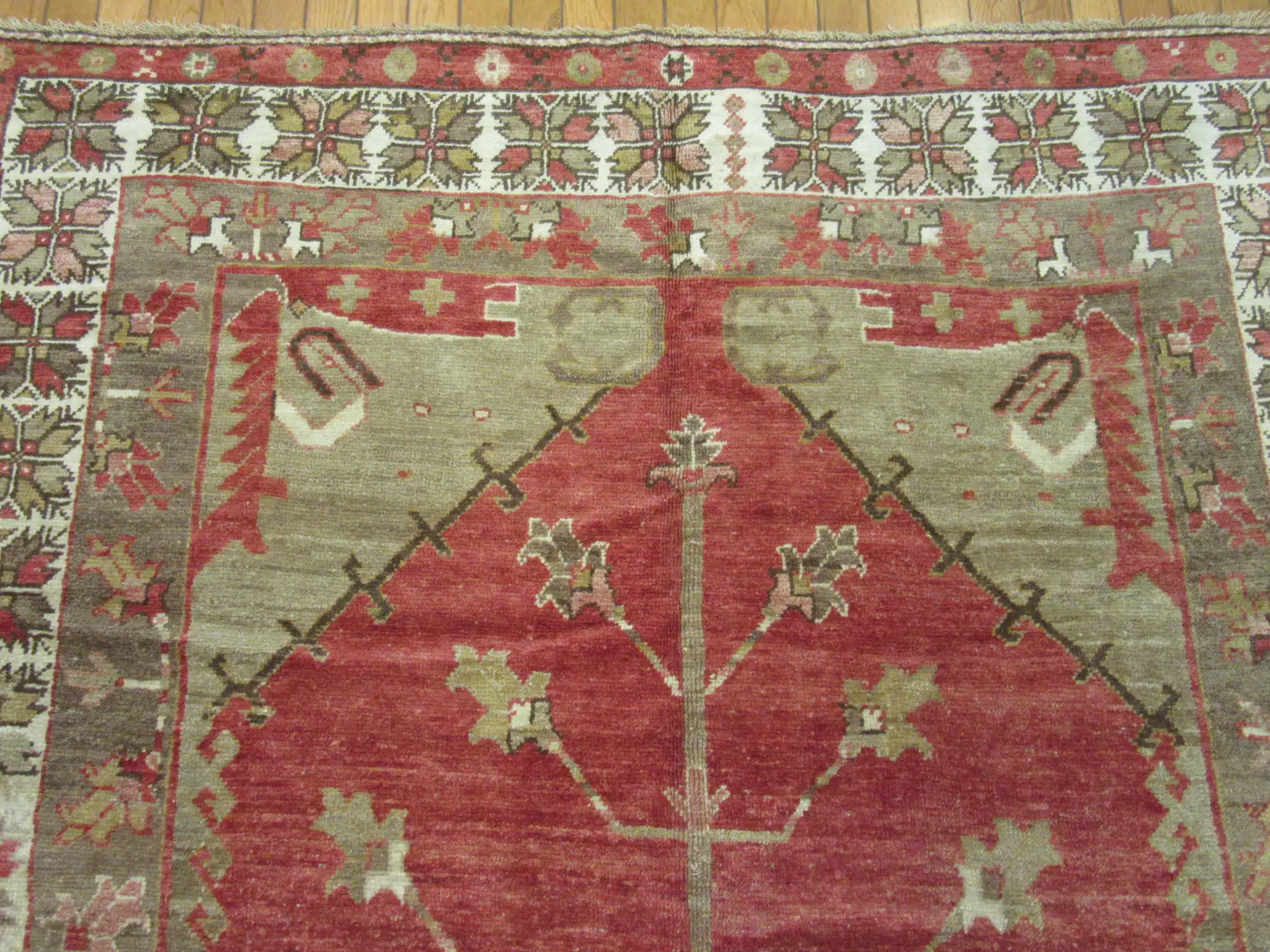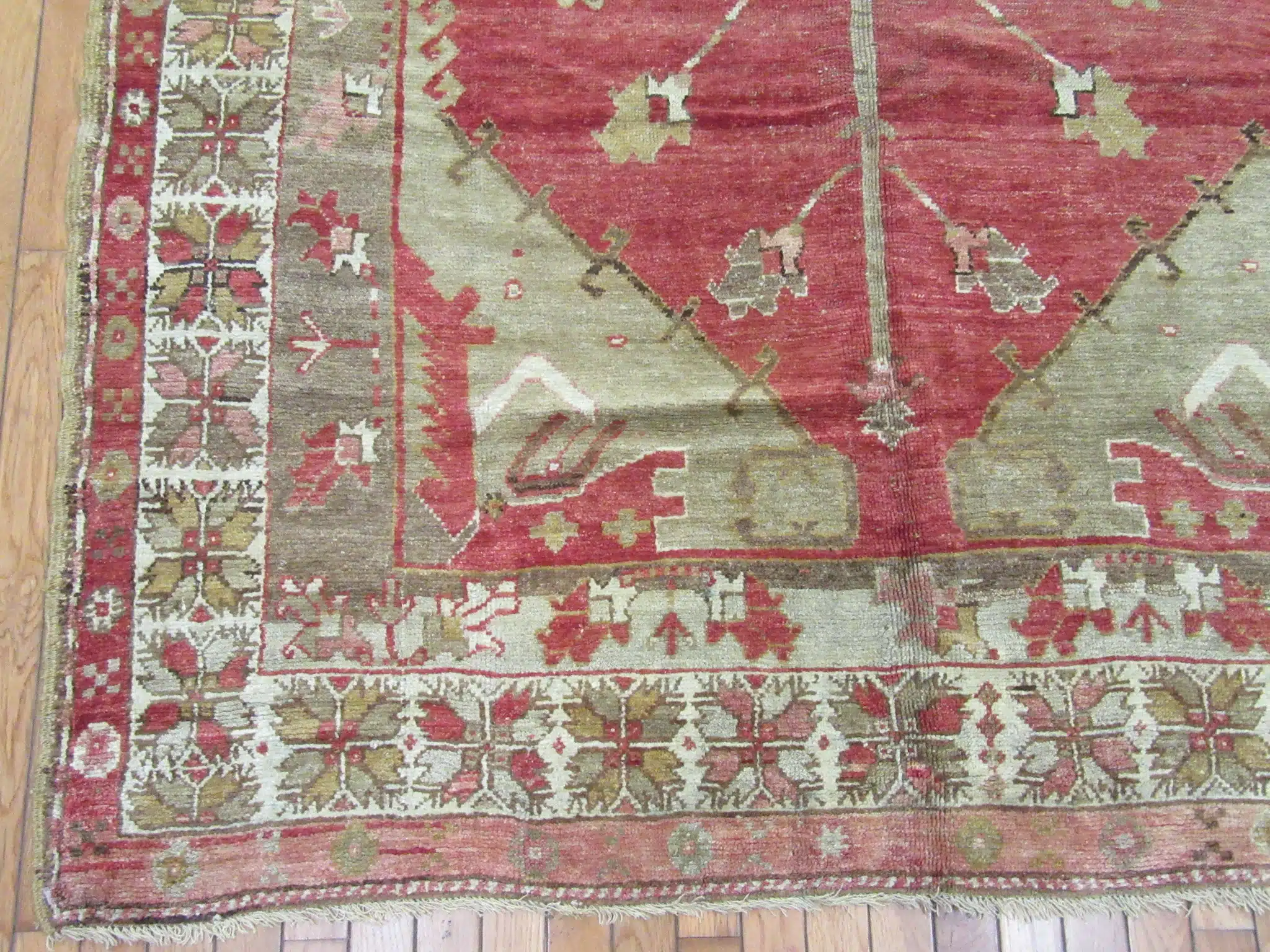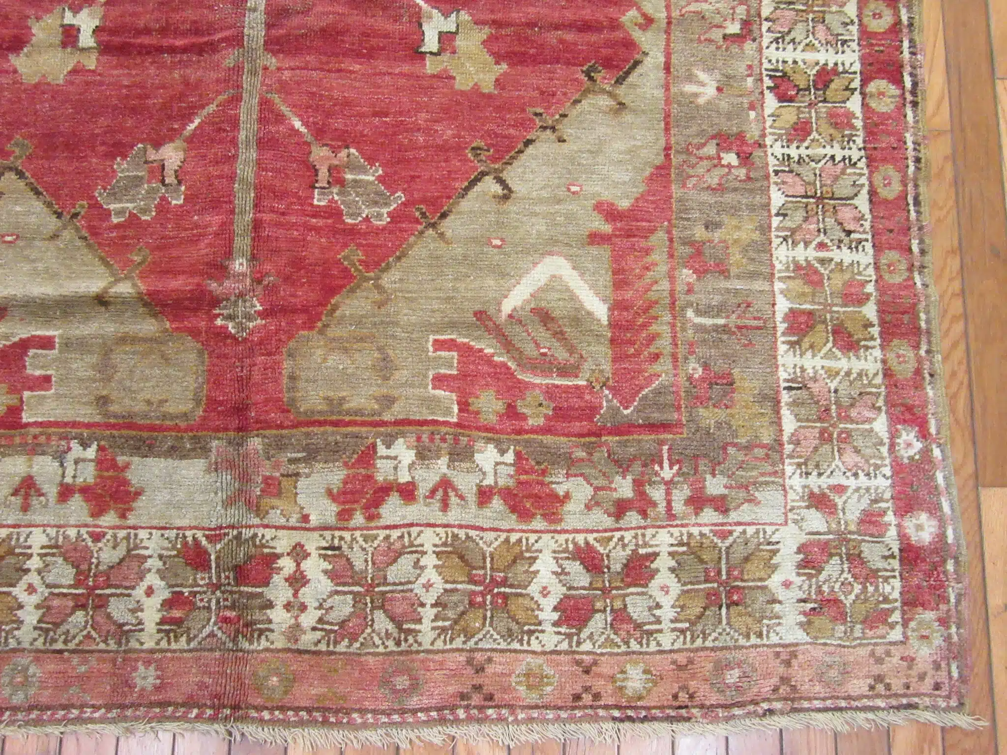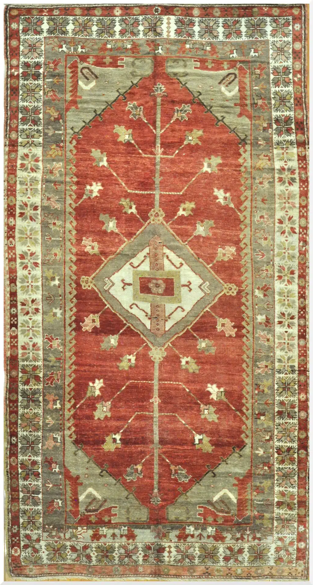 This vintage Turkish rug from around 1960 features a striking elongated central medallion with a diamond shape containing a smaller inner panel in green and ivory, set on a rich red field. Slender tree-like branches extend from the medallion toward the corners, accompanied by small floral and geometric elements that create an open, airy tribal composition. Multiple borders include repeating stylized flowers, hooked motifs, and narrow guard bands in contrasting beige and green, giving the piece a refined yet rustic appearance.
