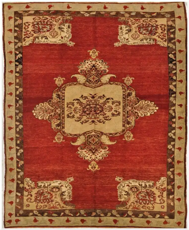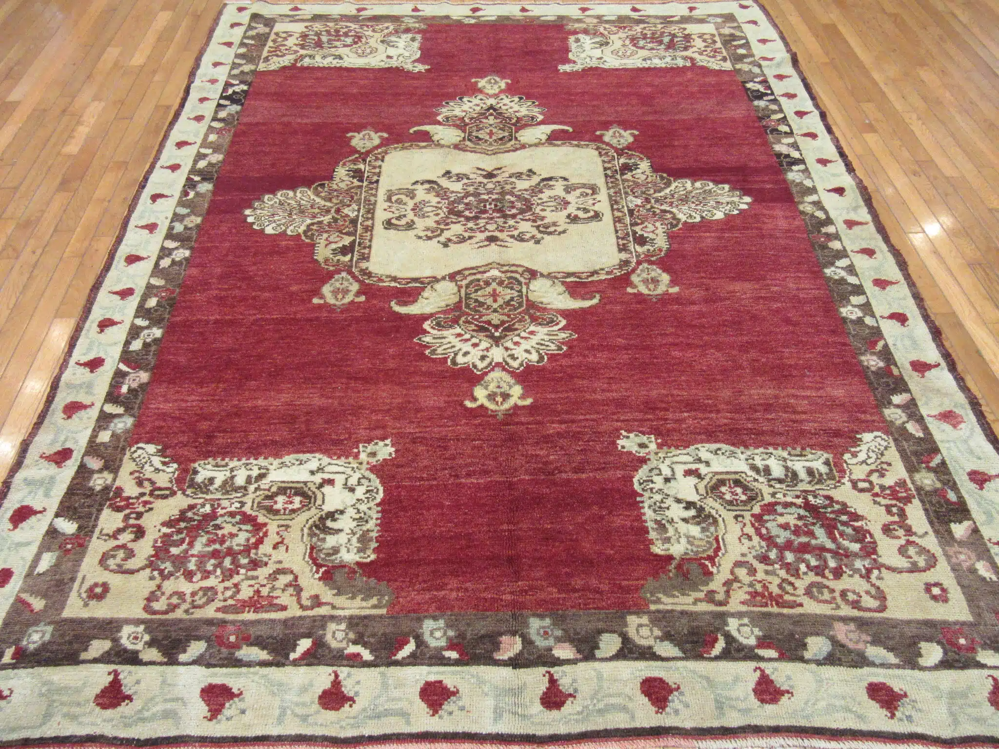 This vintage Turkish rug features a large central medallion with ornate floral and arabesque details in cream and gold, surrounded by a deep red field. Corner spandrels mirror the medallion with scrolling vines and smaller floral elements, while wide borders display repeating stylized flowers, geometric hooks, and narrow guard bands in contrasting beige and green. The overall composition is balanced and classic, with gentle fading that adds a soft, lived-in vintage charm.