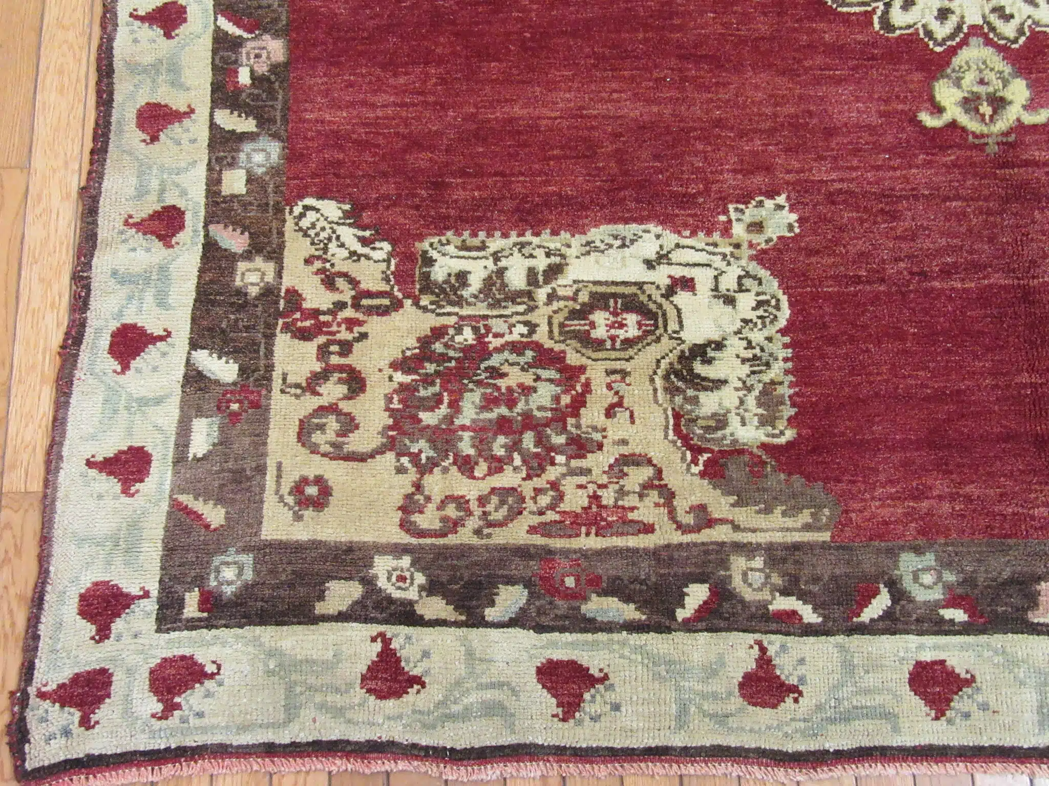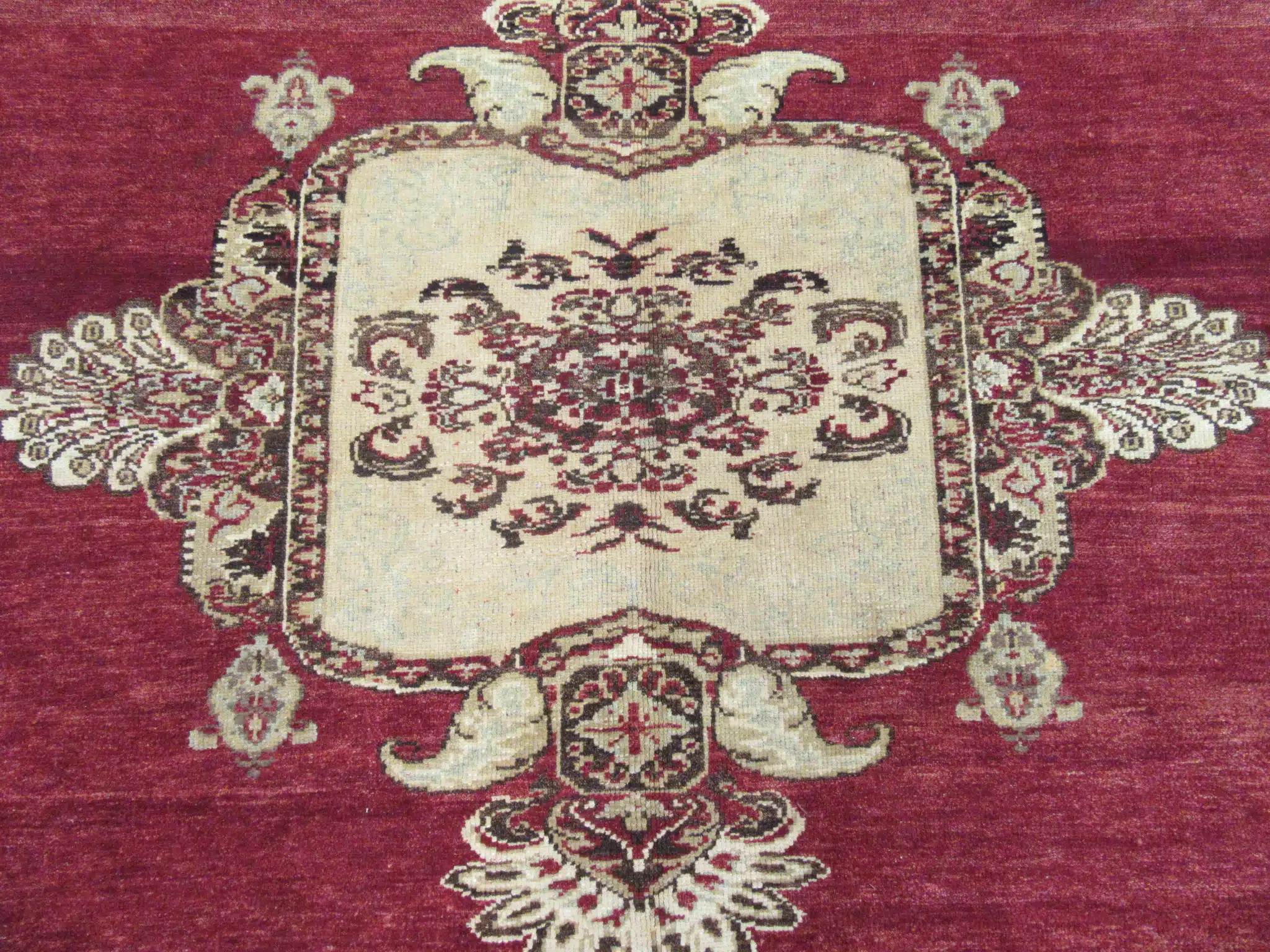 Turkish rugs from the mid-20th century vintage period often combine traditional Ottoman-inspired designs with warmer, more saturated colors and slightly relaxed drawing for a welcoming feel. Natural wool dyes and hand-knotting create subtle variations in tone and texture that improve with age. This piece’s strong red ground and detailed medallion make it a timeless example of Turkish craftsmanship.