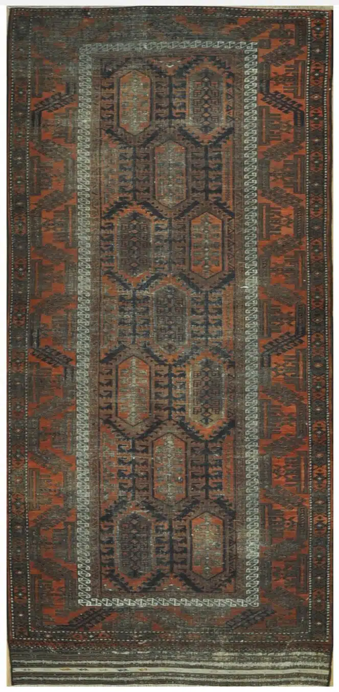 Baluchi rugs are woven by nomadic and semi-nomadic Baluch tribes in the Baluchistan region, spanning parts of southeastern Iran, southwestern Pakistan, and southern Afghanistan. These rugs have been made for centuries using simple horizontal looms, resulting in sturdy, compact designs with strong geometric patterns and a preference for deep, natural dyes like madder root for reds.