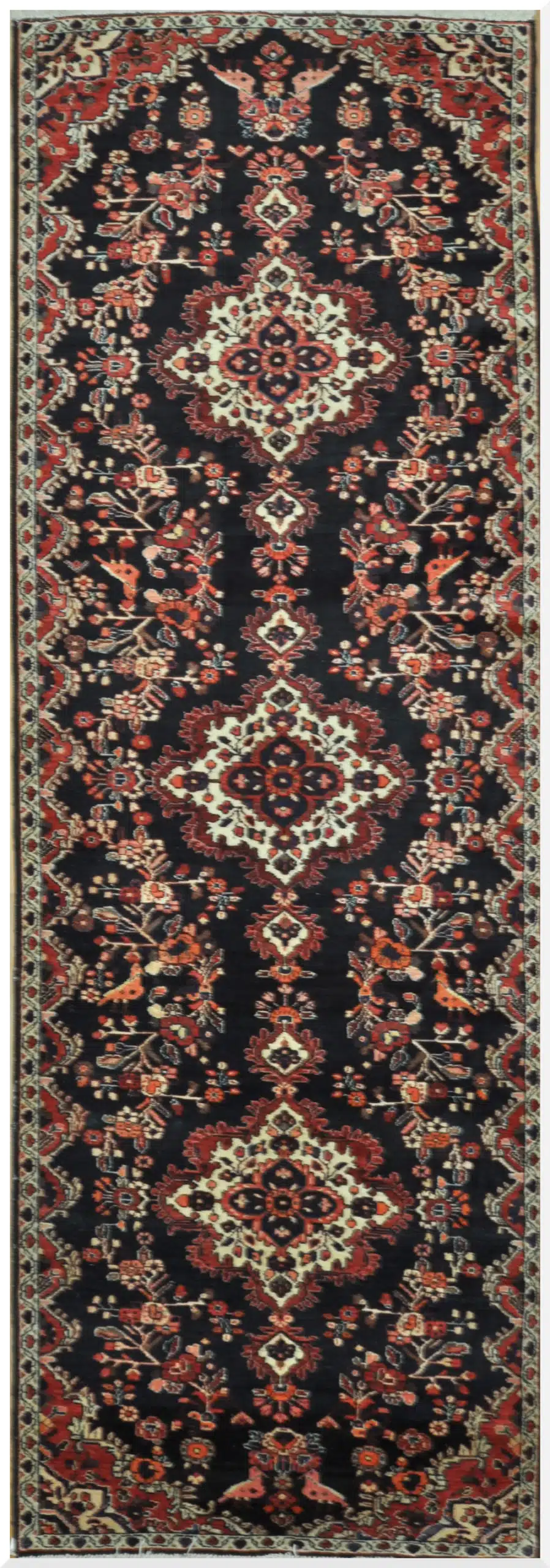 This traditional Persian runner rug features a rich and detailed floral composition arranged along a deep navy blue field. Repeating medallion elements and intricate vine scrolls create a strong sense of rhythm and symmetry, making the design visually engaging from end to end.