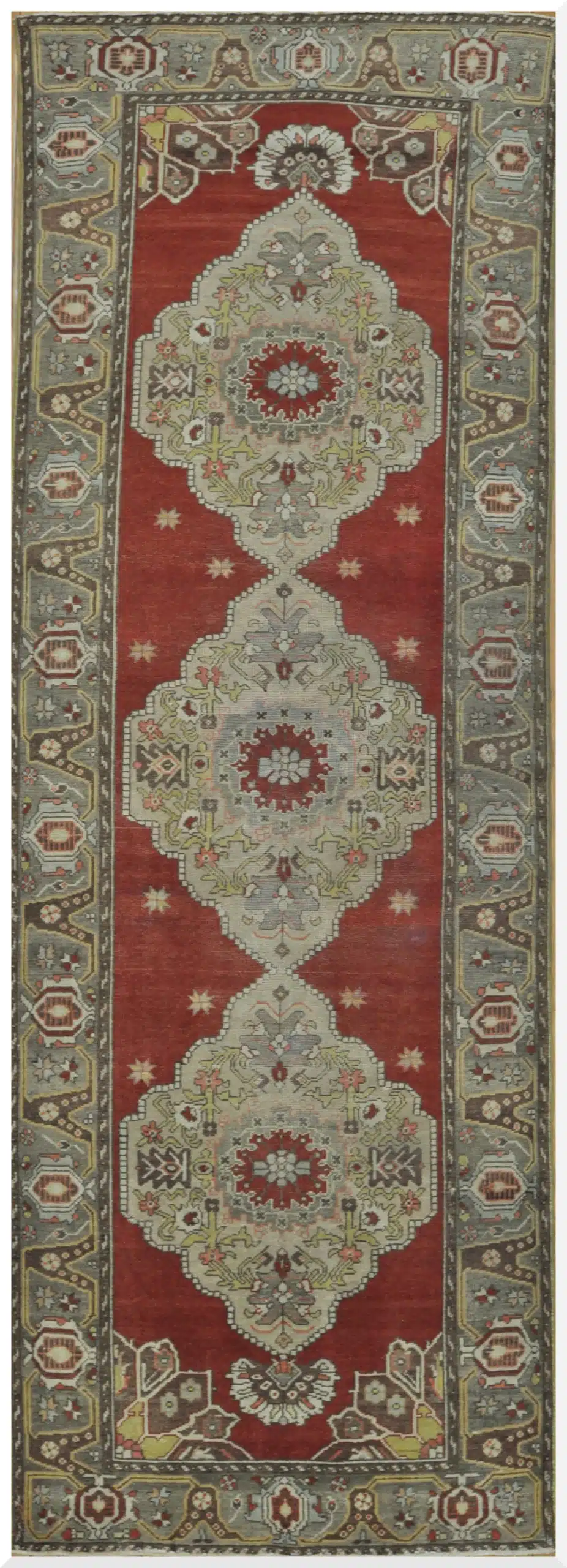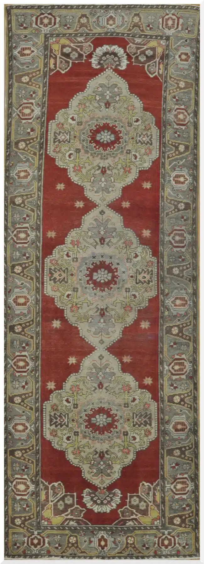 This vintage Turkish rug features an elegant double-medallion design set against a rich rust-red field, creating a strong yet refined visual rhythm. The medallions are delicately outlined in soft sage and cream tones, offering a balanced contrast that feels both classic and approachable.