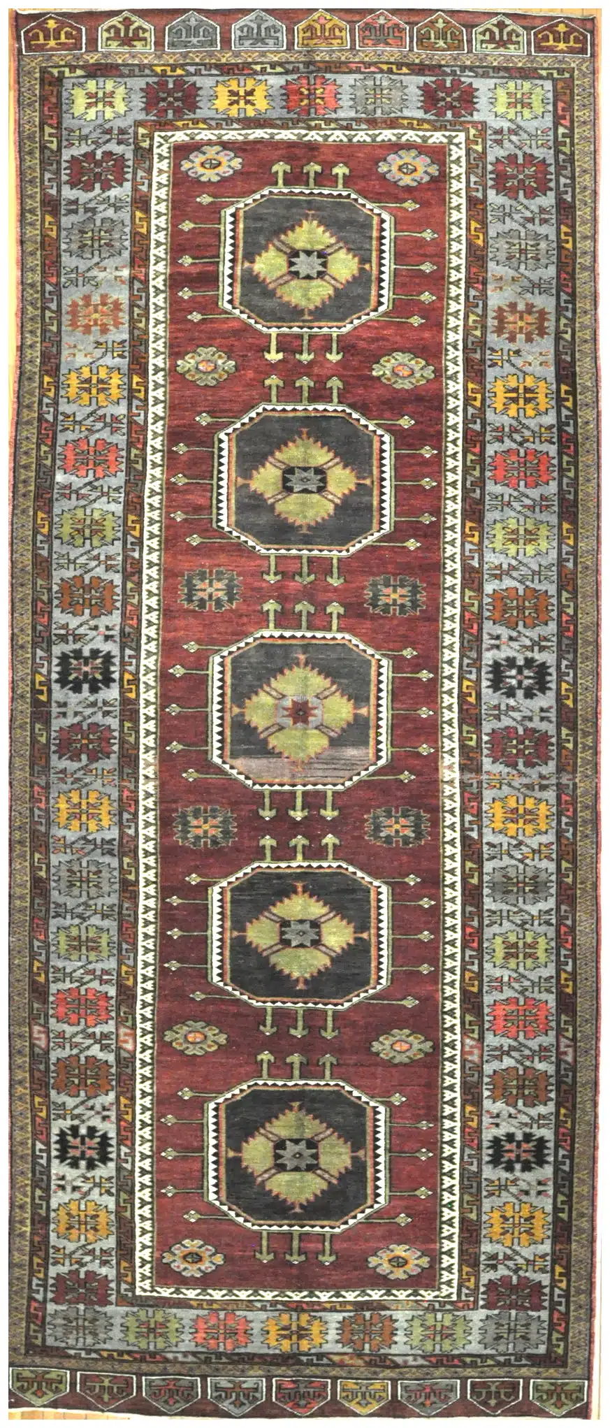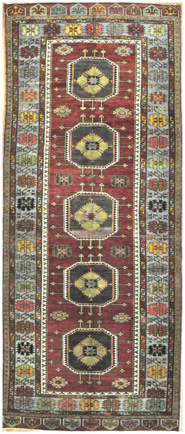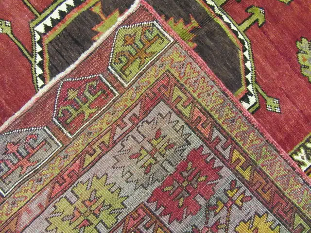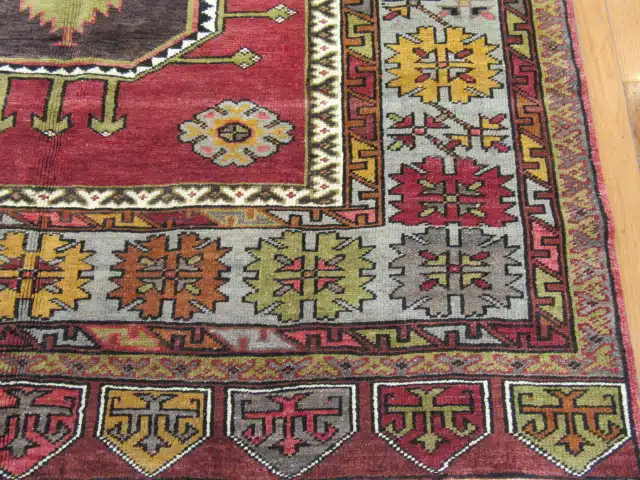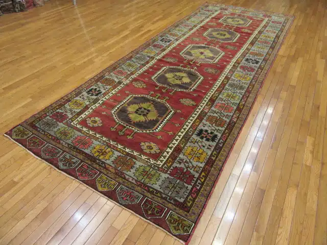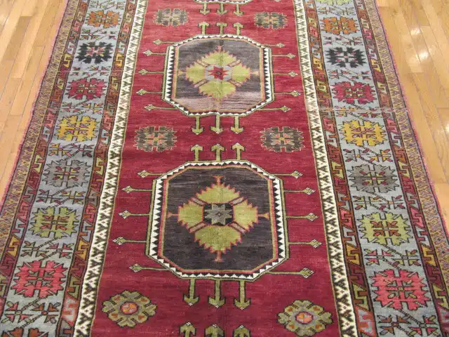 This is a vintage hand knotted rug from the central Anatolian region of Turkey. It is made with wool?on wool?foundation and?primary colors?in a simple geometric triple medallions design. ? The rug is perfect for an entry or a wide hall. It is in great condition.