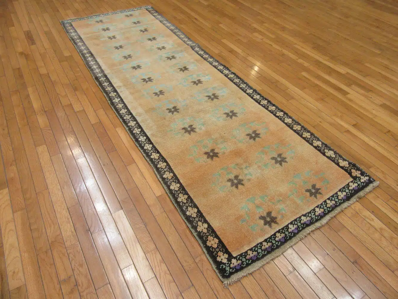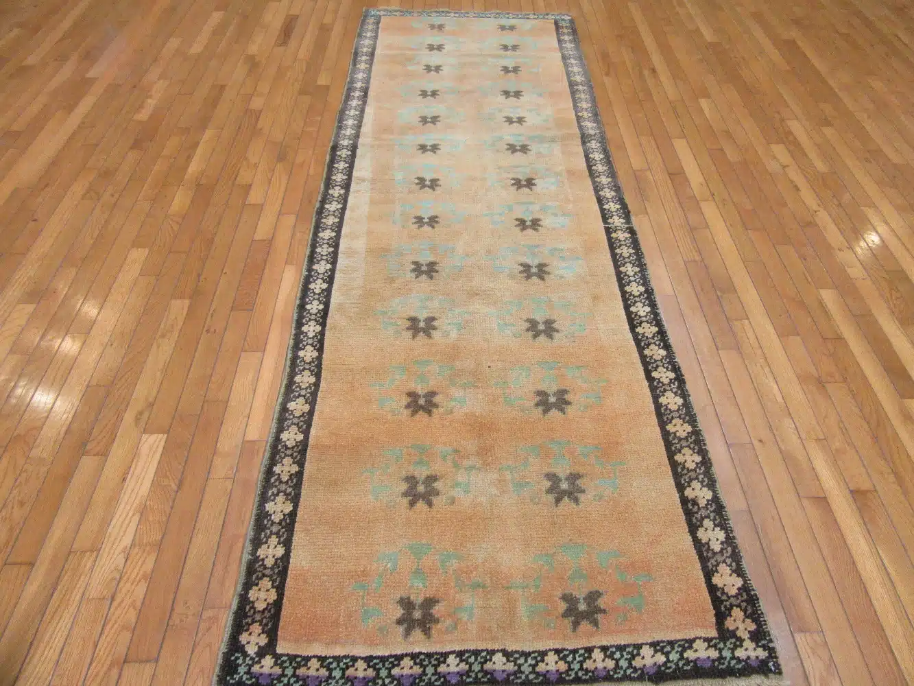 Woven with wool pile on a cotton foundation, this runner reflects skilled Anatolian craftsmanship and offers durability suitable for everyday use. The texture is comfortable underfoot while maintaining crisp pattern clarity.