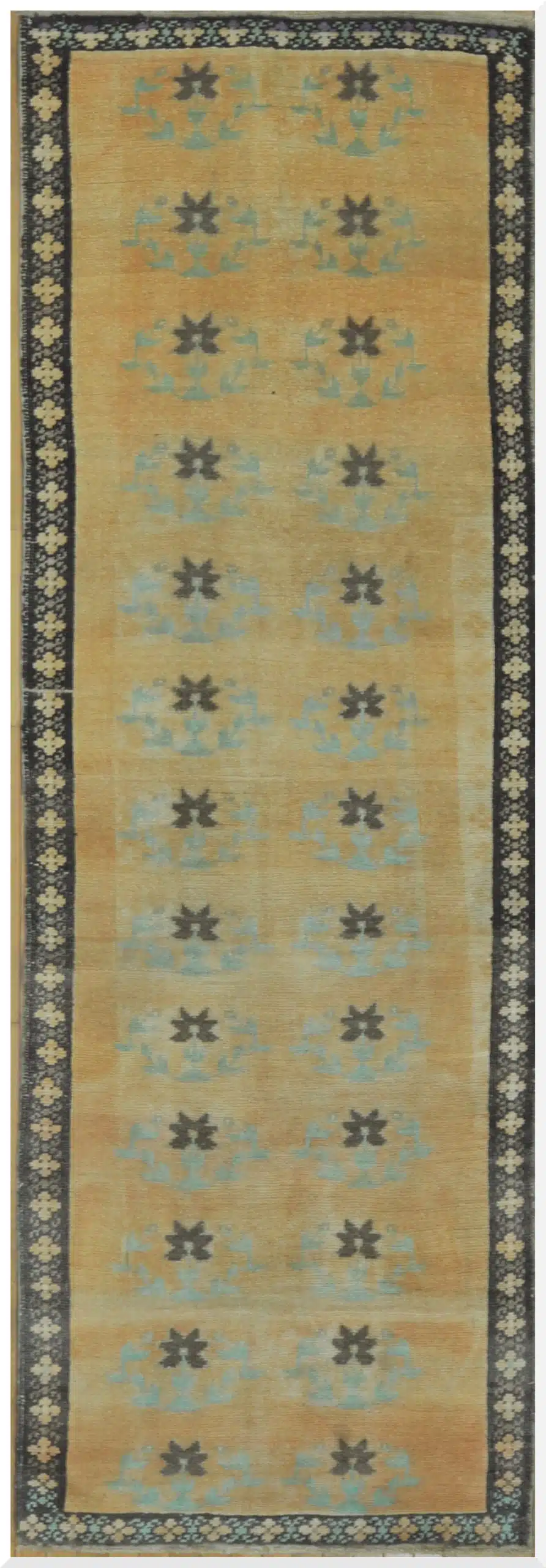 The warm golden ground is complemented by soft blue accents and subtle charcoal detailing, while the dark border with ivory floral elements provides contrast and definition. The restrained palette gives the rug a timeless quality that blends easily with both classic and contemporary interiors.