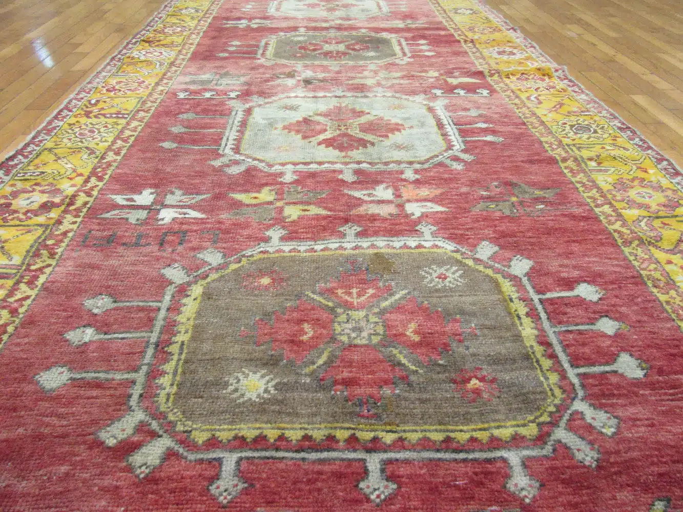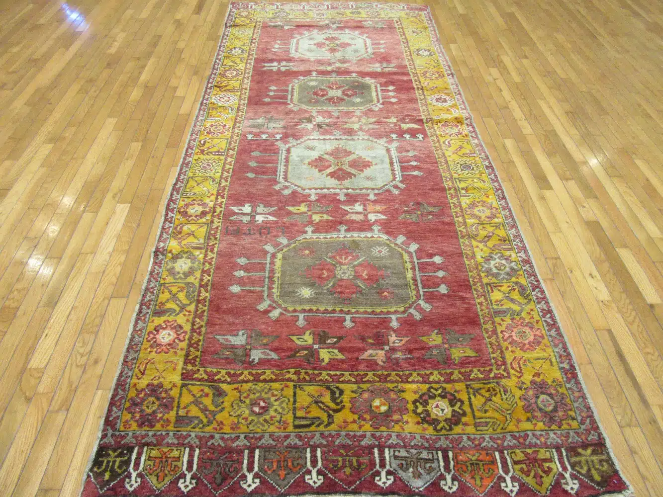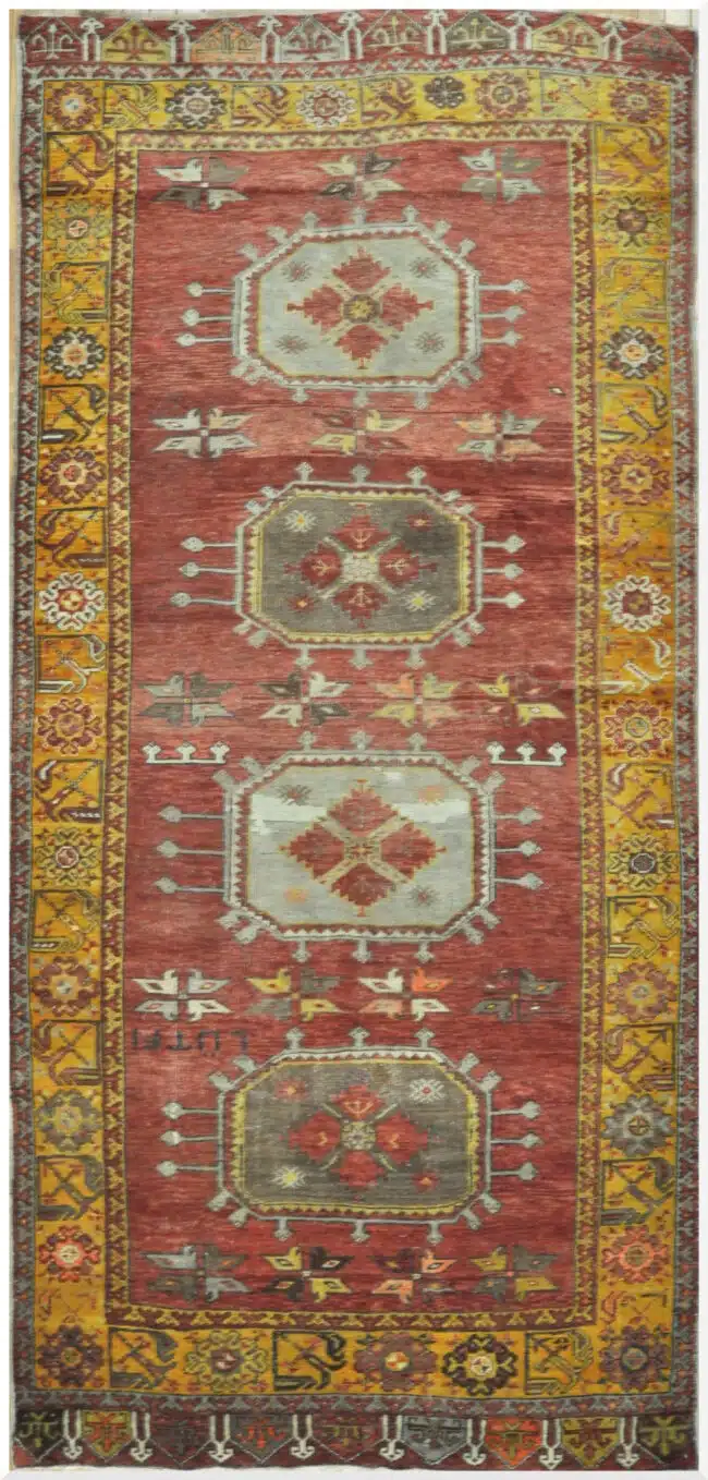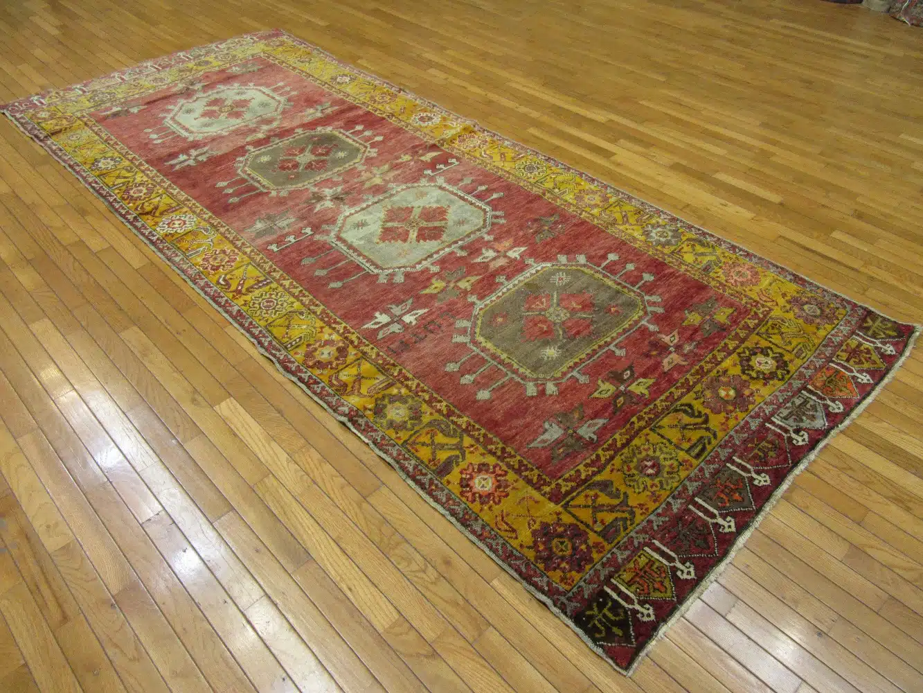 This vintage handmade Turkish rug showcases a striking series of geometric medallions arranged vertically along a rich red field, framed by an intricate golden yellow border. The balanced composition and softened palette give the rug a refined transitional character, blending traditional Anatolian motifs with a more relaxed, decorative feel.