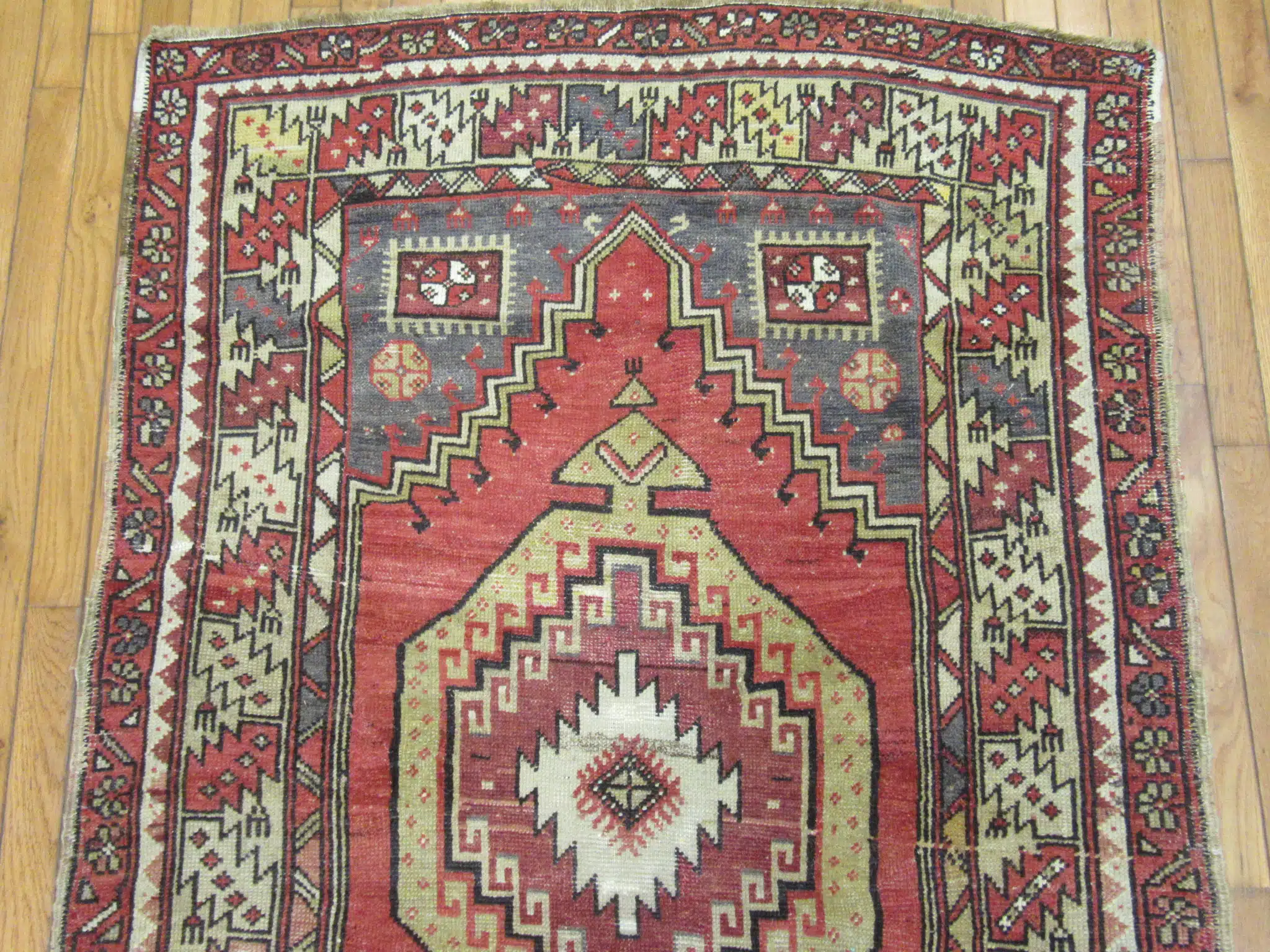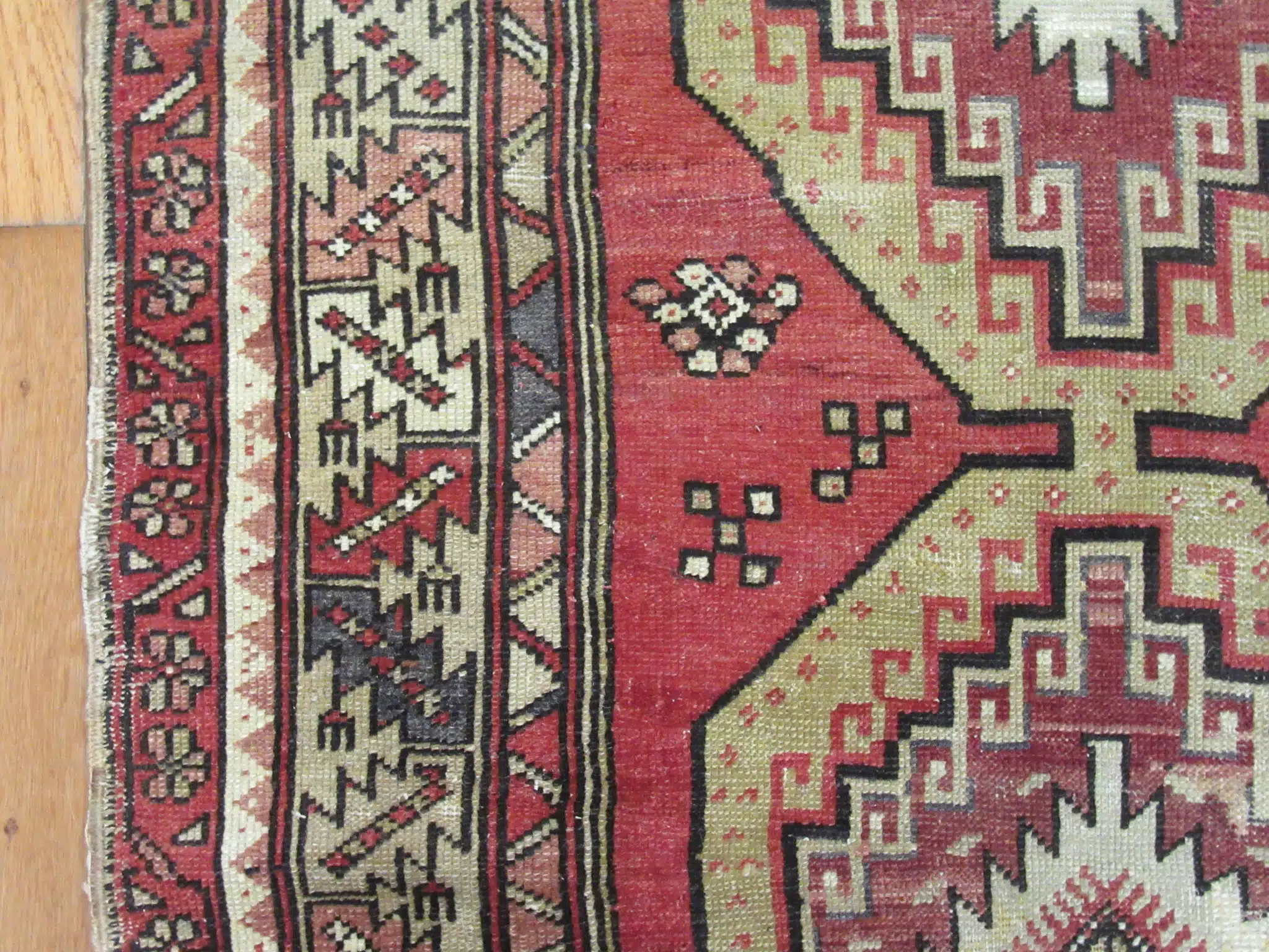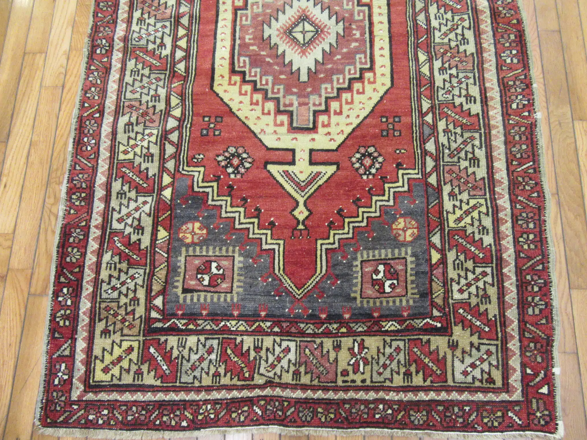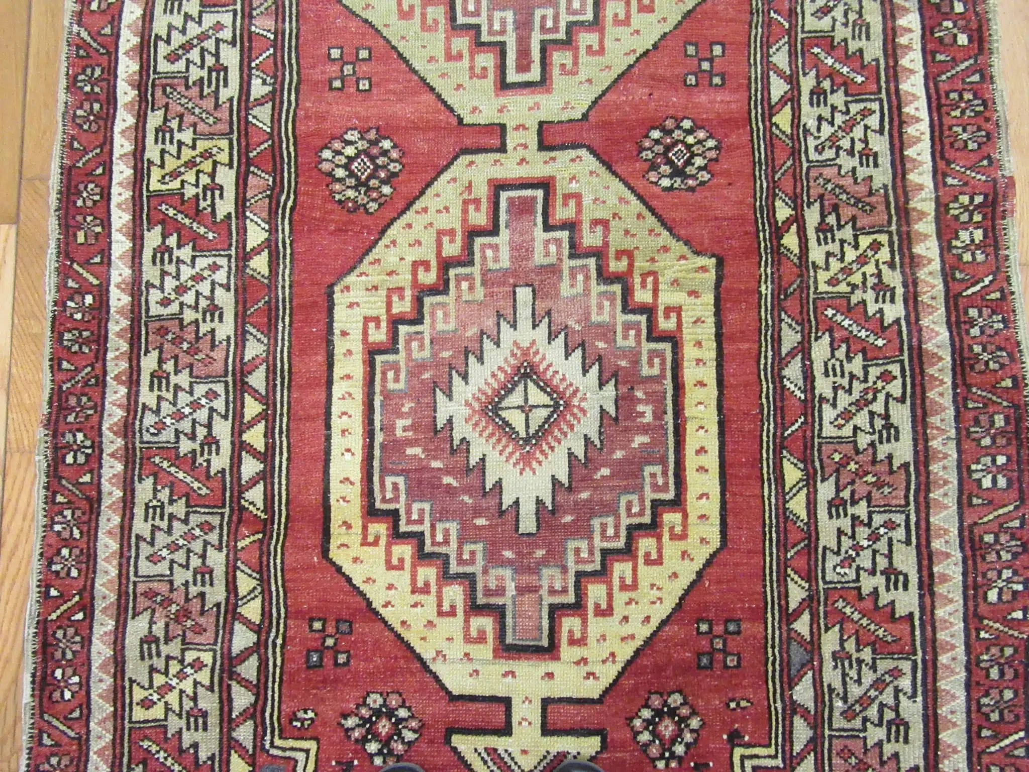 This vintage Turkish Anatolian rug showcases a bold geometric medallion design set on a warm rust-red field, accented with ivory and soft yellow highlights. The stepped diamond medallions create a strong visual presence while maintaining a balanced, symmetrical composition.
