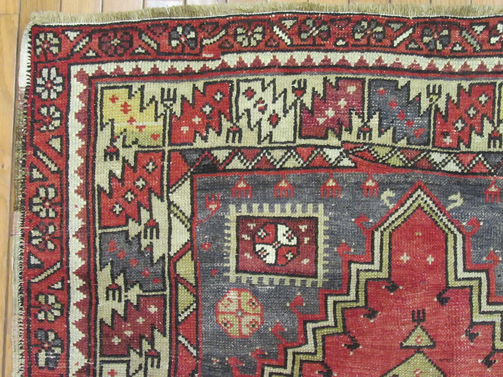 The borders are richly detailed with traditional tribal motifs in earthy tones and muted blues, framing the rug with depth and character. Subtle abrash and natural dye variations enhance the authenticity and age of the piece.