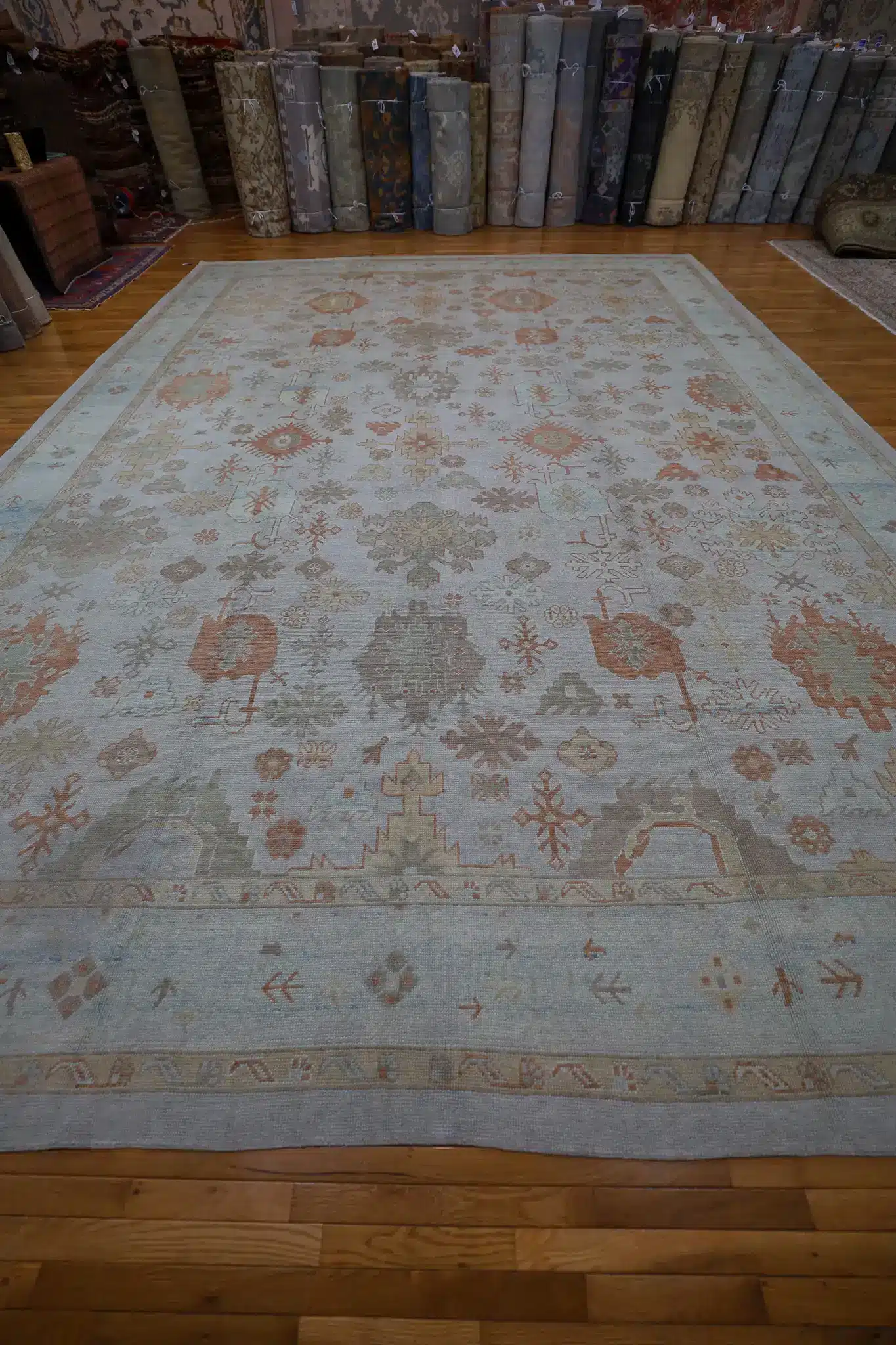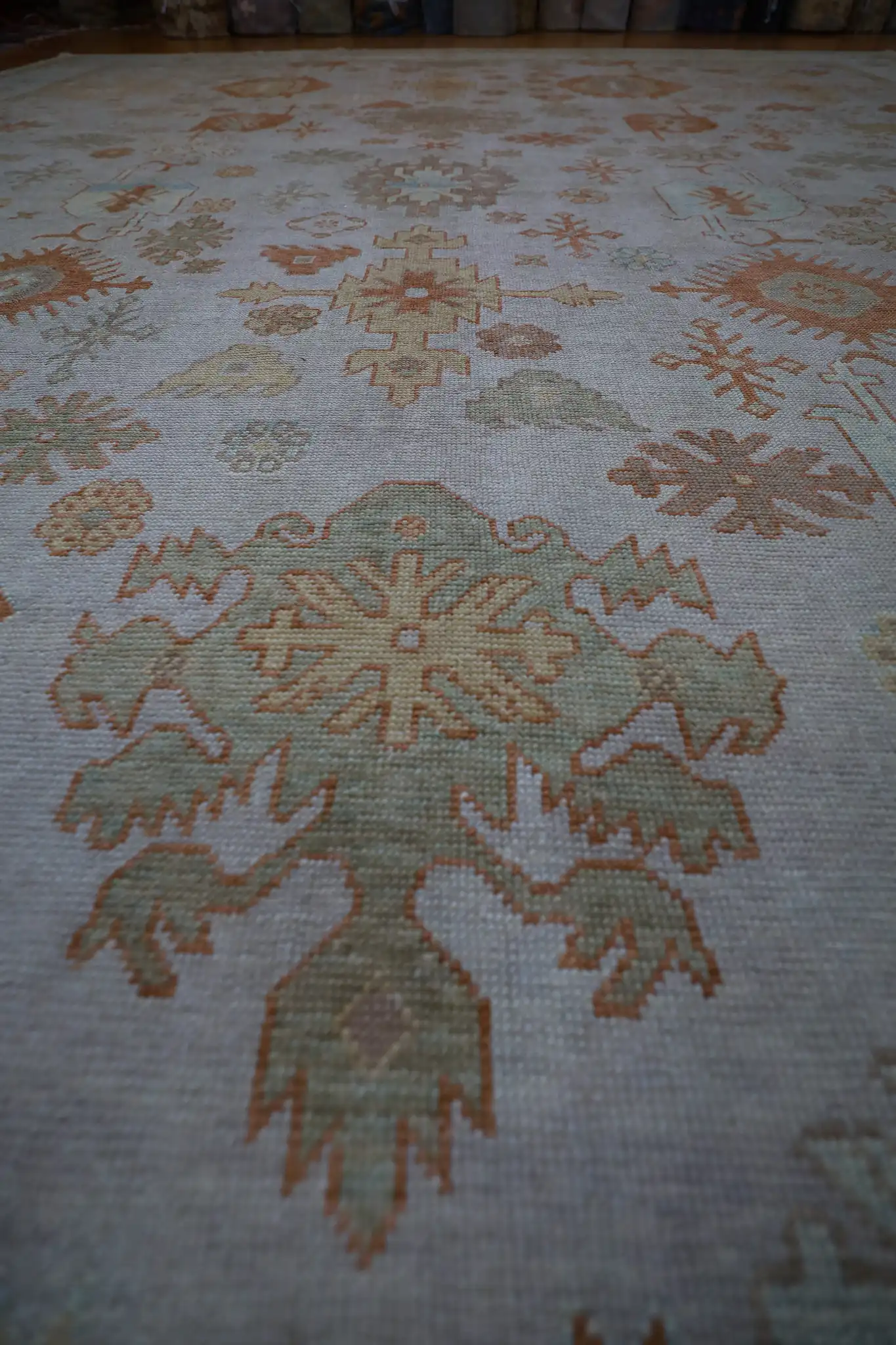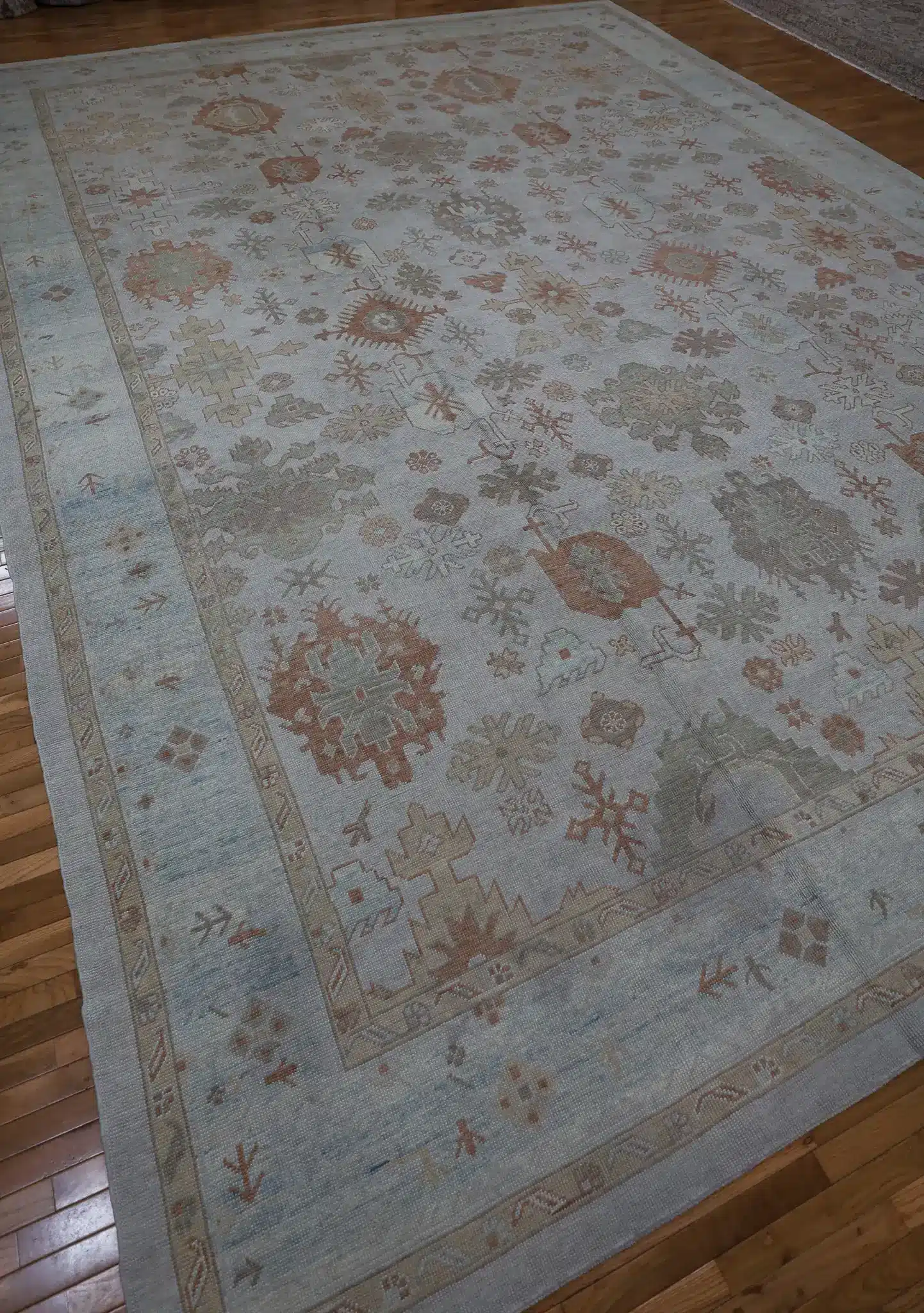 The durable wool construction offers exceptional resilience and comfort, making this oversized rug ideal for great rooms, large living areas, formal dining spaces, or expansive foyers with moderate to high traffic. Its generous dimensions anchor substantial furniture arrangements while the pale field keeps the room feeling open and inviting. Regular vacuuming and professional cleaning every few years will preserve the warm colors and maintain the pile’s luxurious texture.