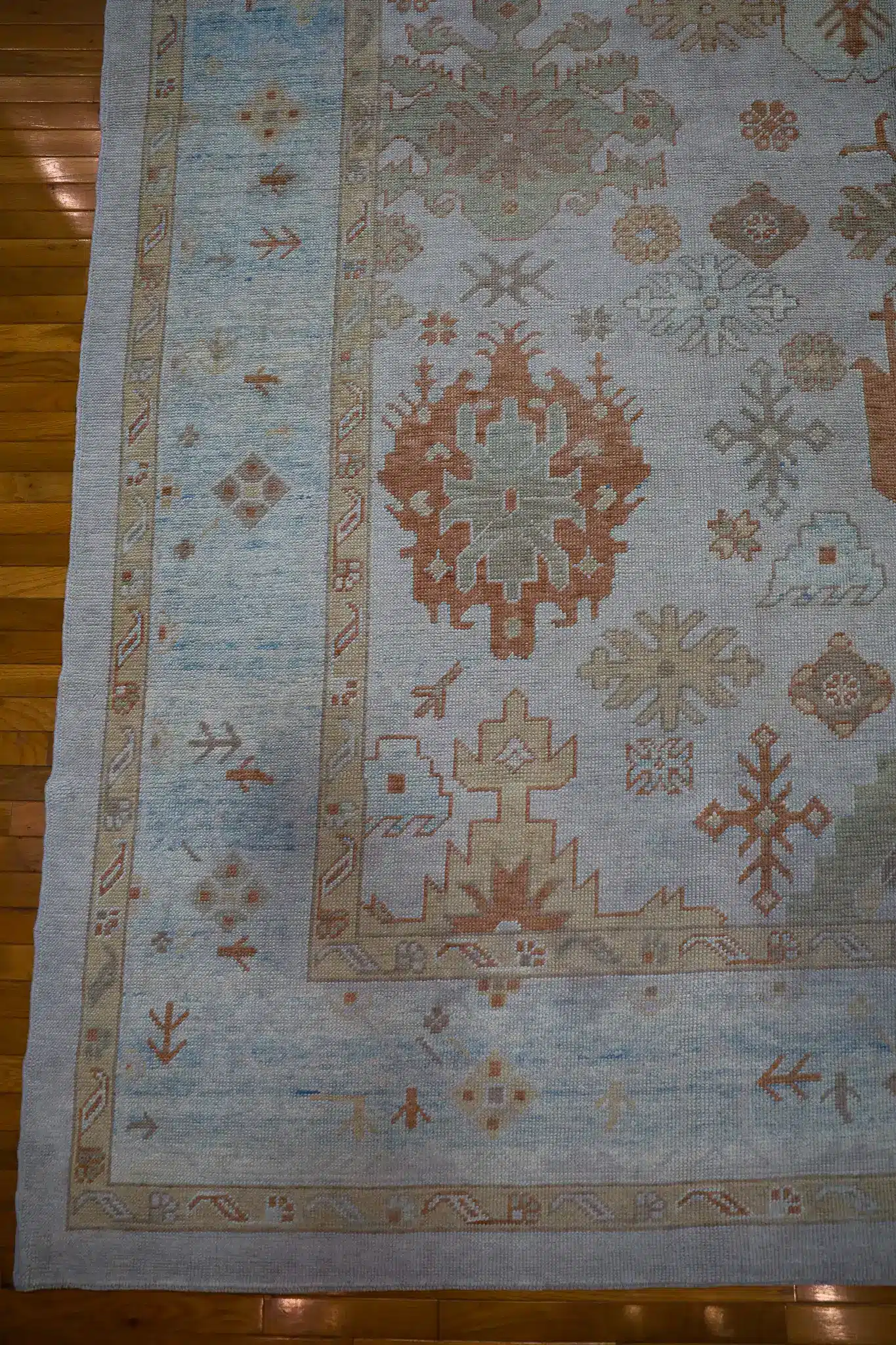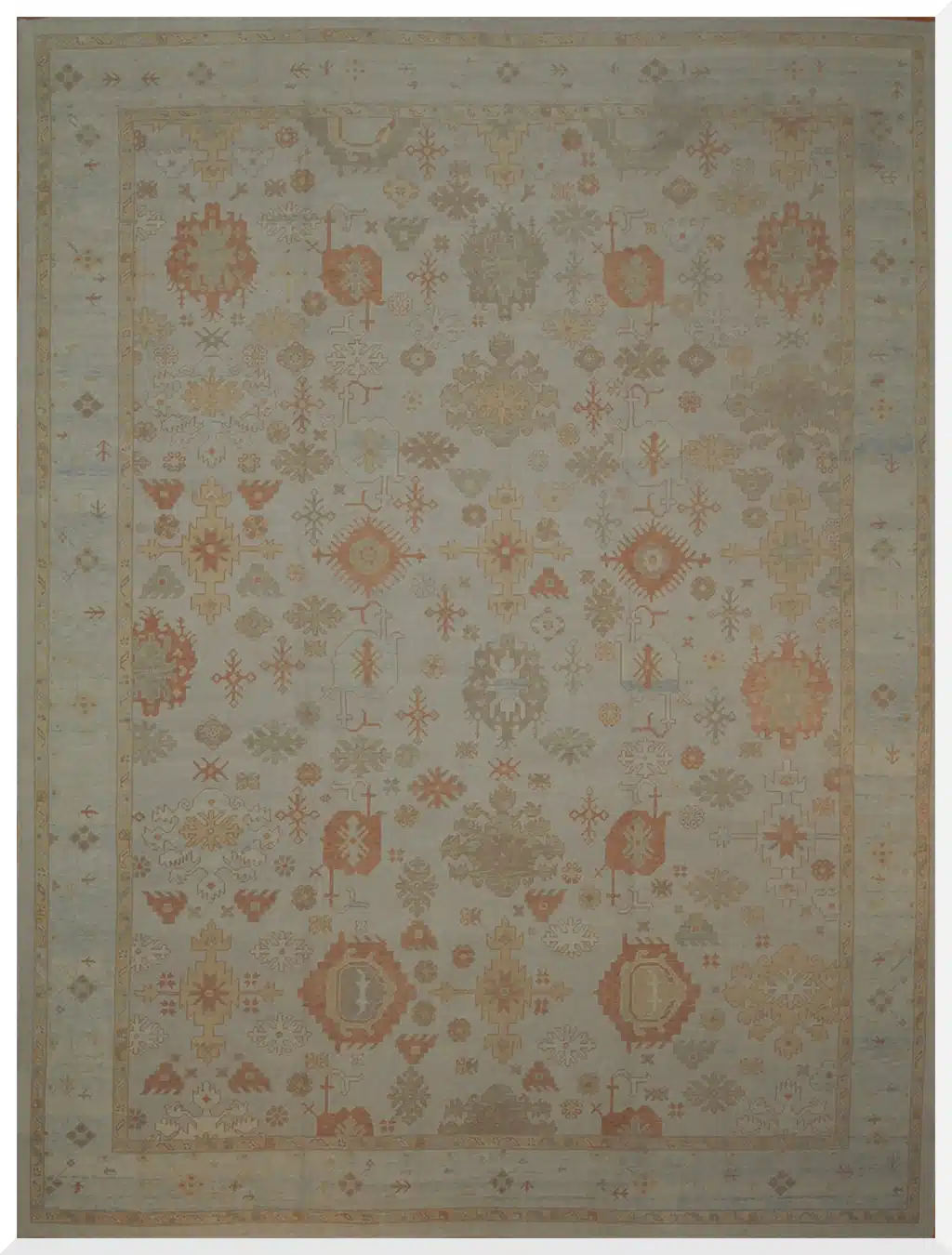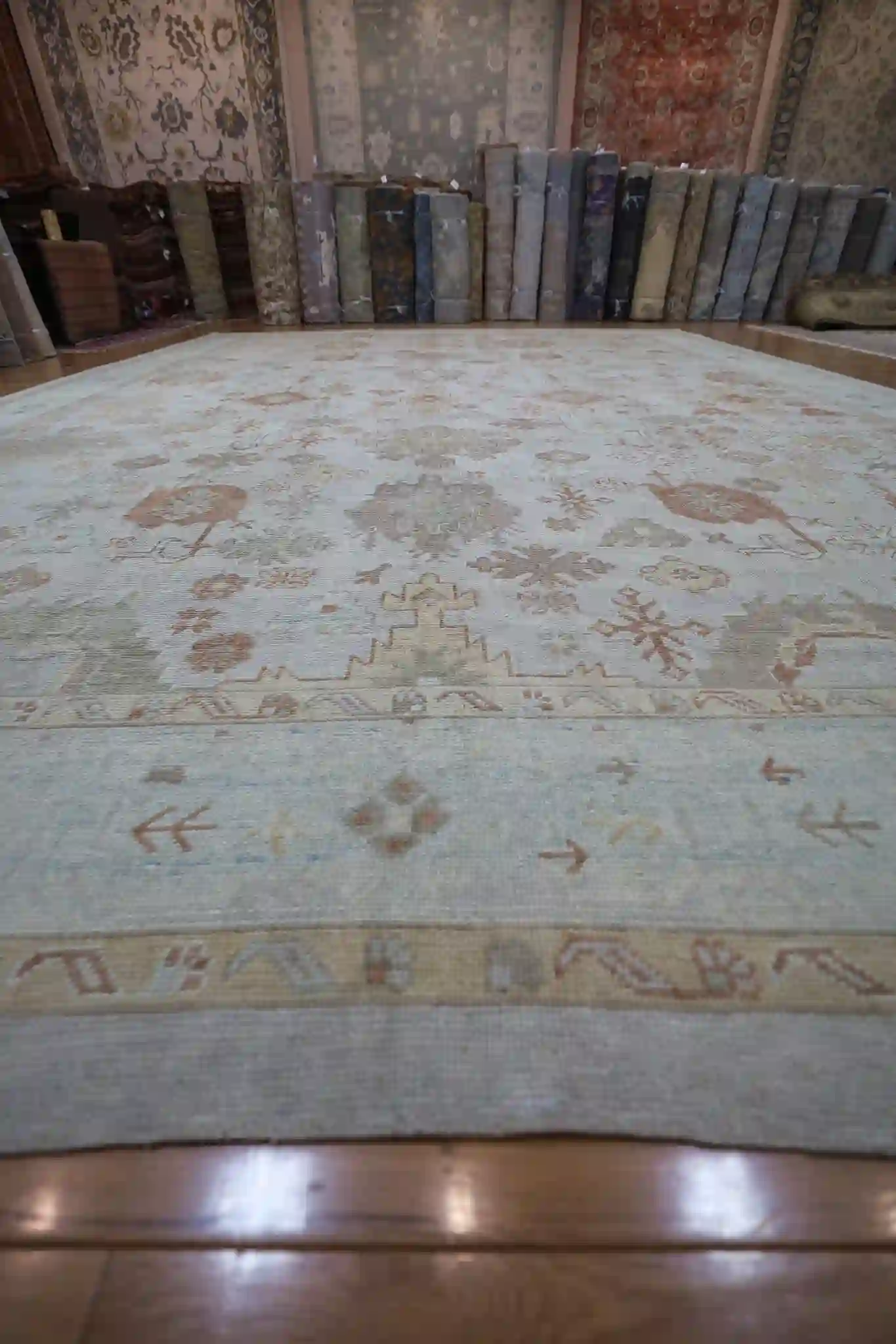 The durable wool construction offers exceptional resilience and comfort, making this oversized rug ideal for great rooms, large living areas, formal dining spaces, or expansive foyers with moderate to high traffic. Its generous dimensions anchor substantial furniture arrangements while the pale field keeps the room feeling open and inviting. Regular vacuuming and professional cleaning every few years will preserve the warm colors and maintain the pile’s luxurious texture.