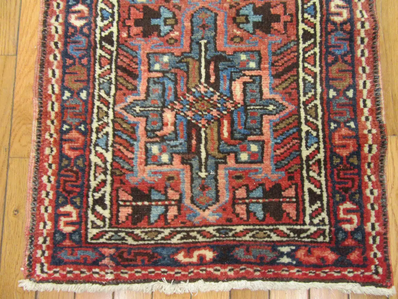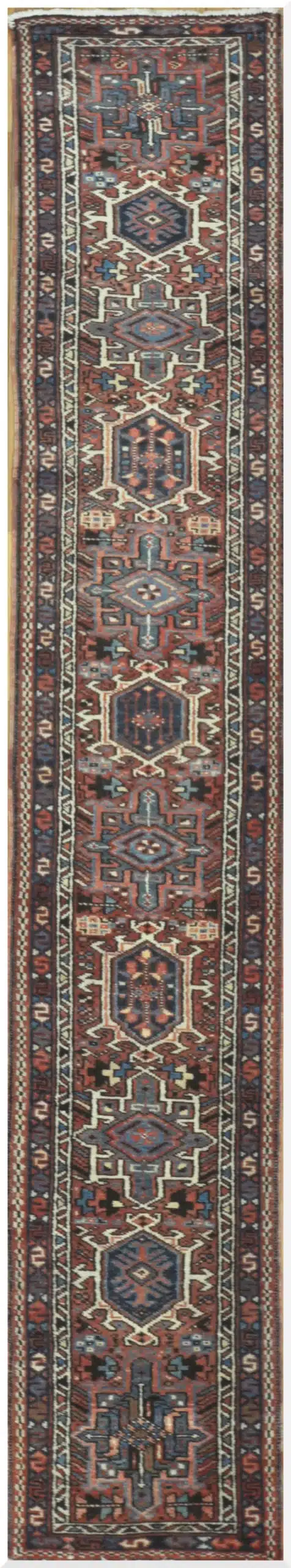 This vintage Persian runner features a rich red field accented by bold geometric medallions and traditional tribal motifs, creating a striking and timeless design well suited for hallways and narrow spaces.