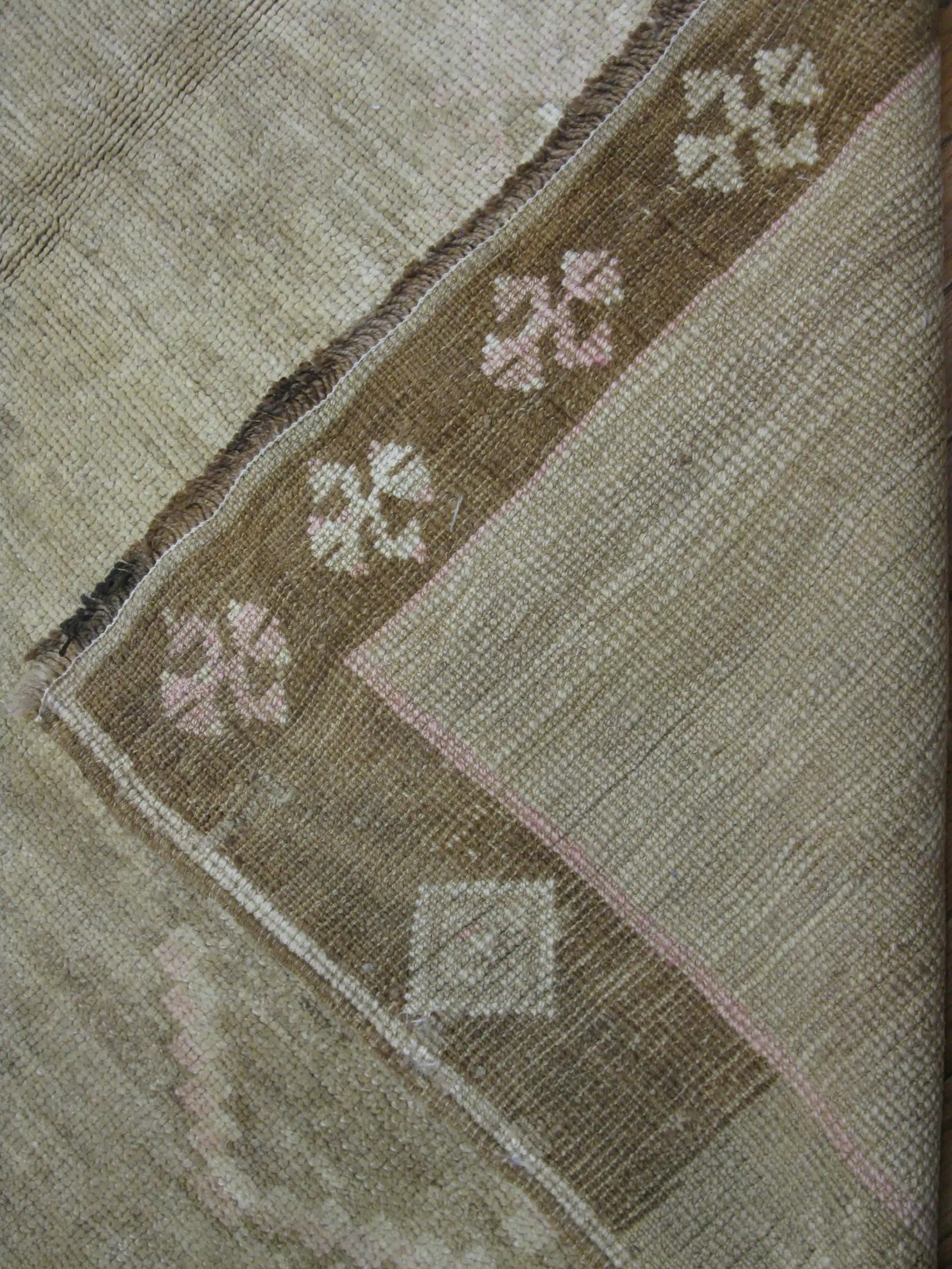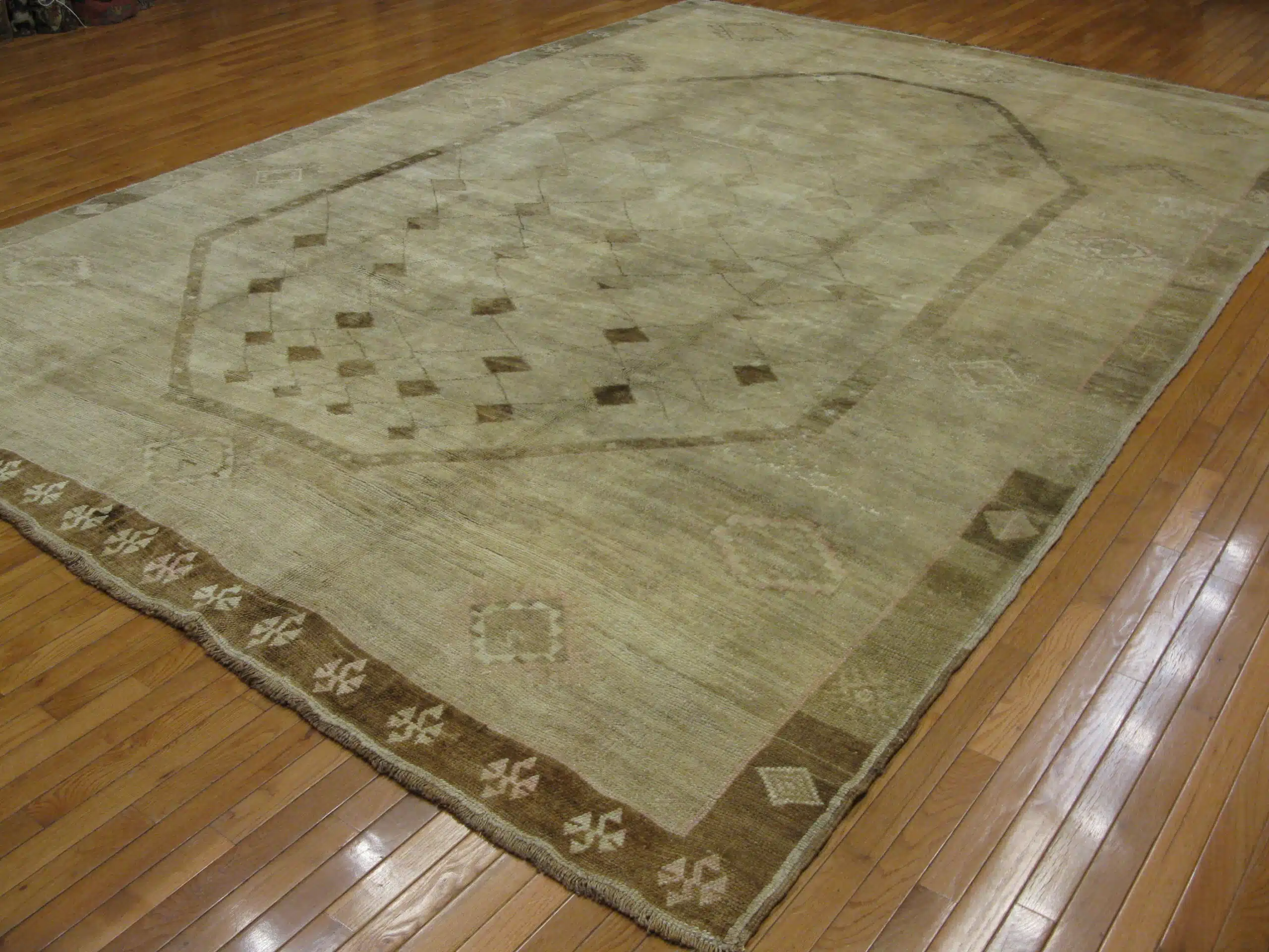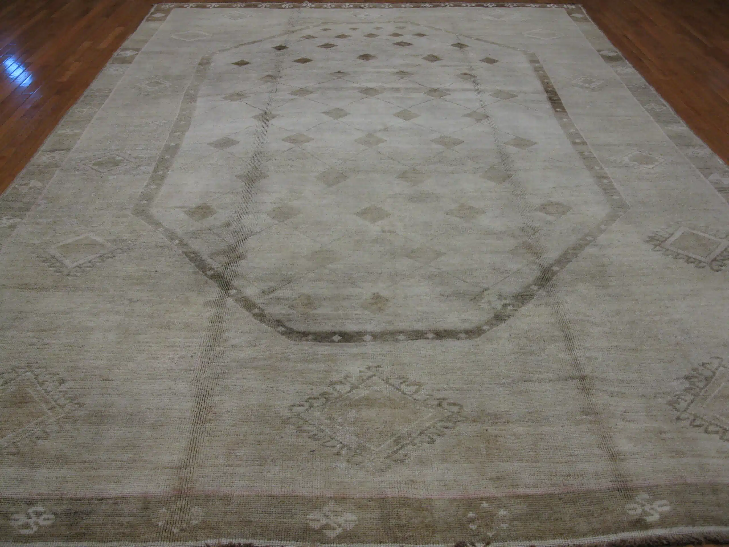 Hand-knotted from wool over a cotton foundation, the rug carries the durability and authenticity expected of vintage Oushak weavings. The naturally aged dyes and generous proportions give it a serene, collected presence—ideal for interiors that value quiet luxury and enduring character.