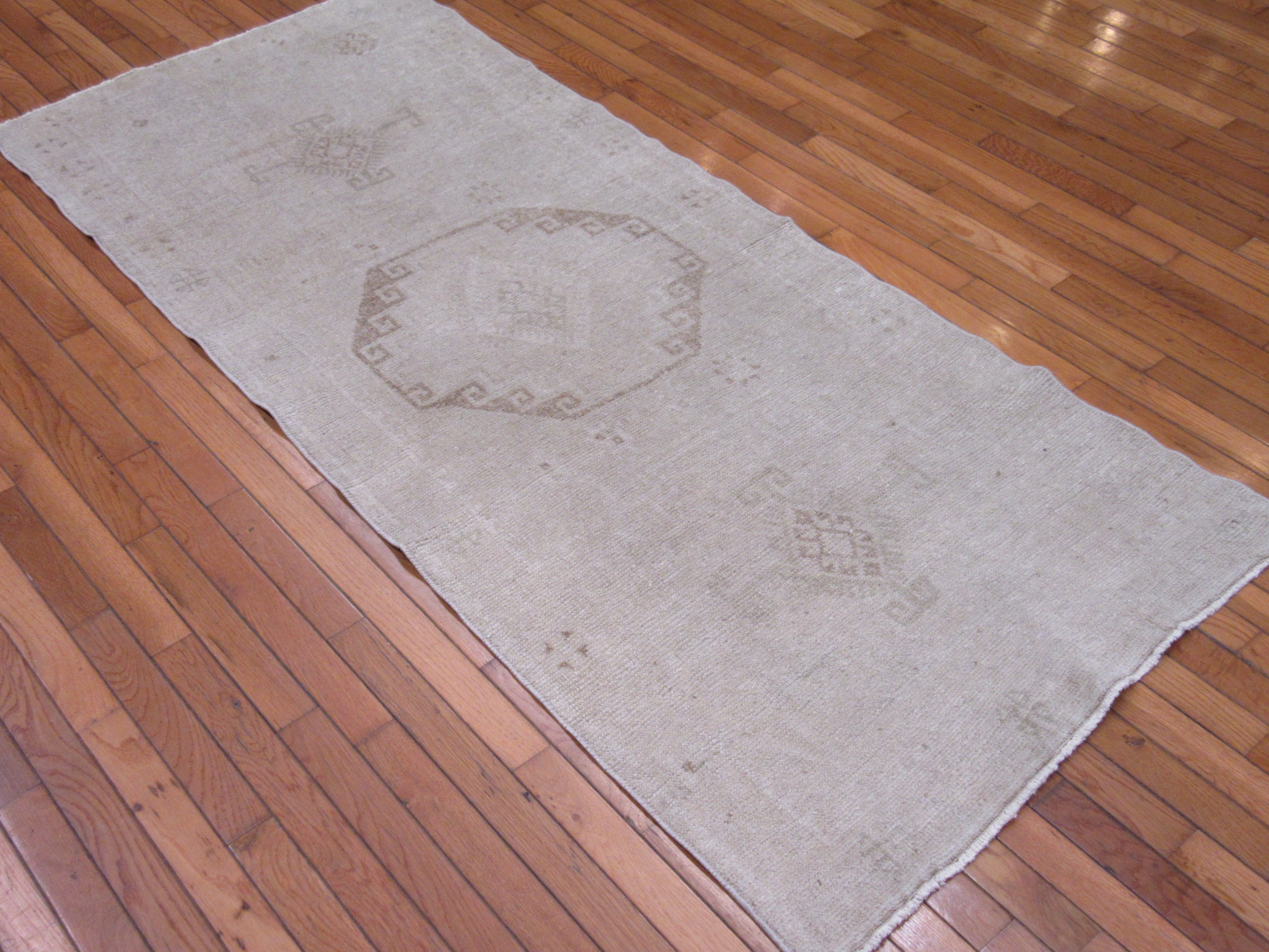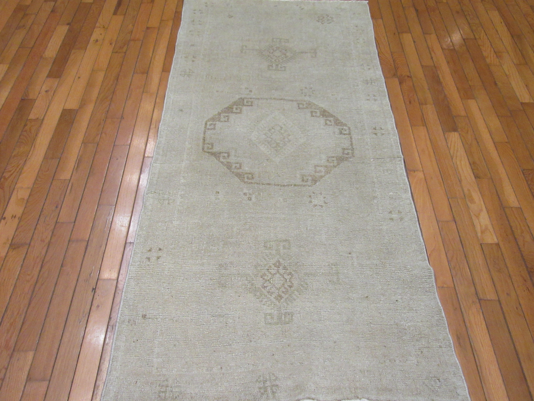 This is an antique washed hand knotted vintage Turkish rug. It is made with wool in a simple geometric design. It is in great shape.
