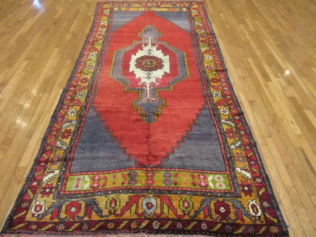 This vintage hand-knotted Anatolian rug features a powerful tribal composition centered around a striking geometric medallion set against a rich brick-red field. The medallion is framed by stepped motifs and contrasting charcoal-gray panels, creating a strong visual balance and architectural presence.