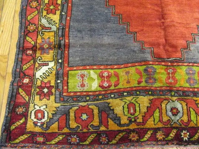 The borders are filled with lively floral and geometric elements rendered in warm gold, ivory, and olive tones, adding rhythm and movement around the central field. These motifs are characteristic of Anatolian tribal weaving traditions, often symbolizing protection, continuity, and prosperity.