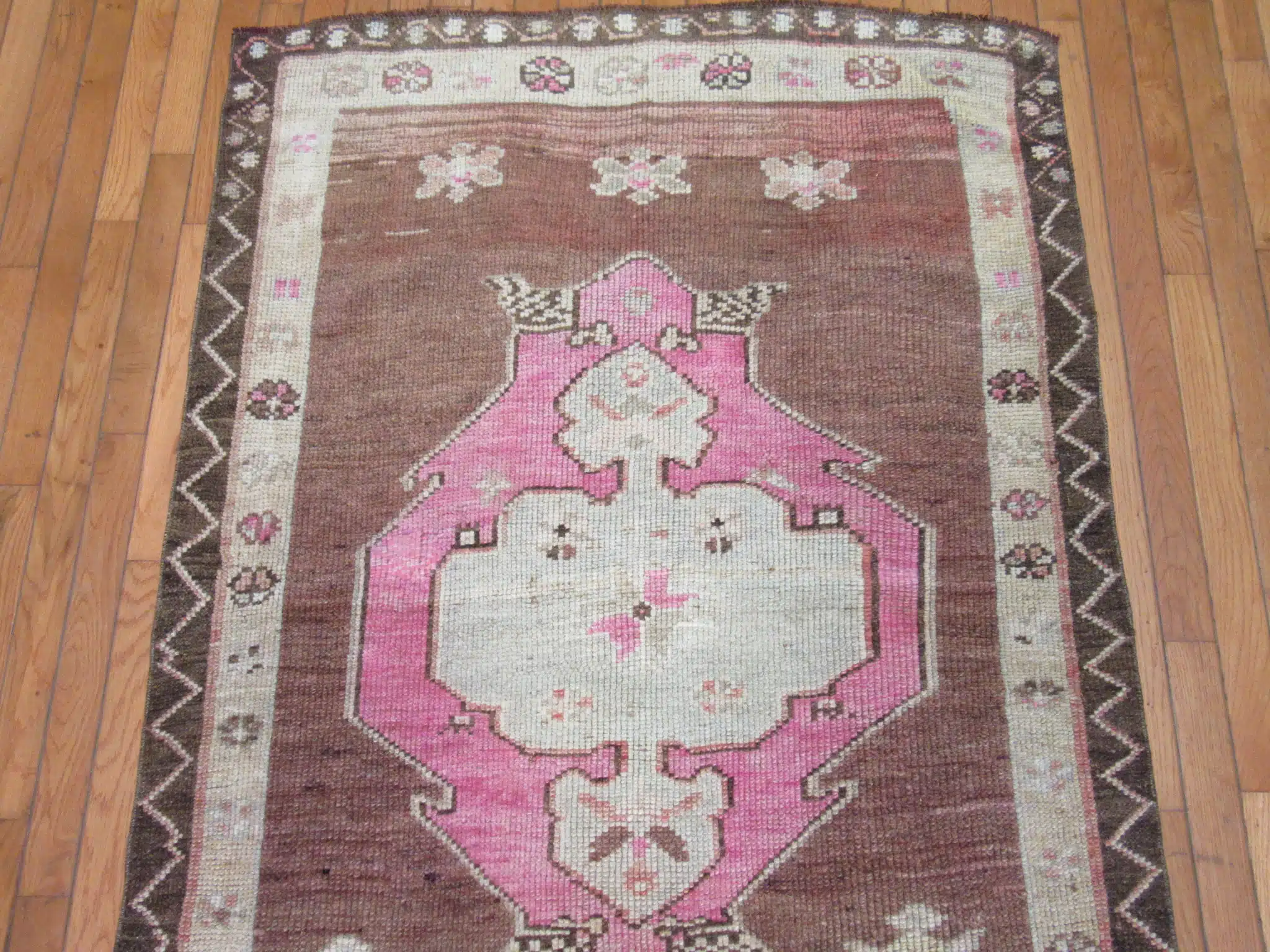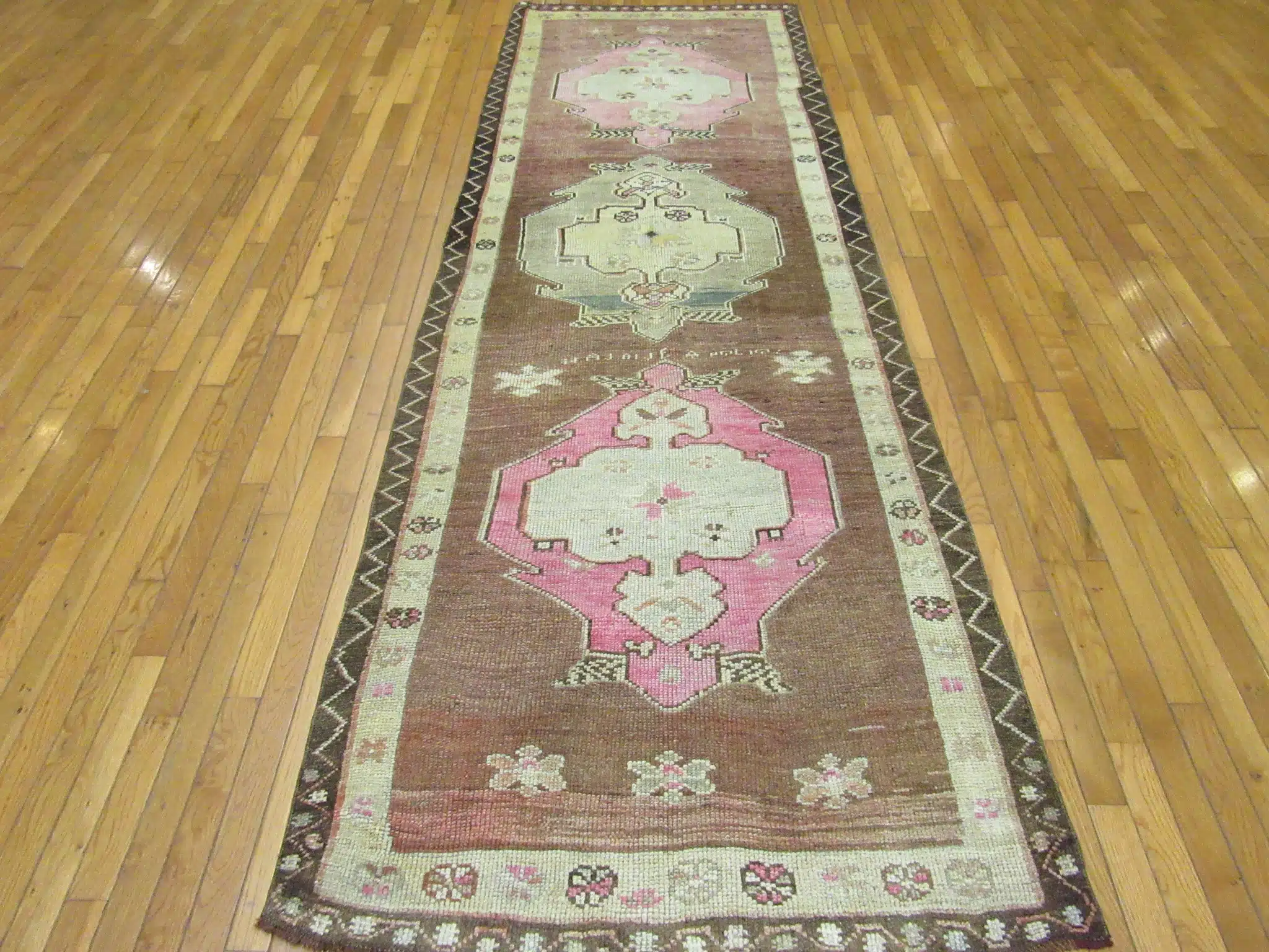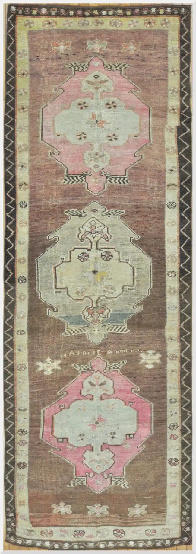 This authentic Turkish runner showcases a beautiful balance of earthy brown tones framed by delicate pink and ivory geometric medallions. The symmetrical layout reflects classic Anatolian craftsmanship, where precision knotting meets cultural storytelling through traditional motifs.