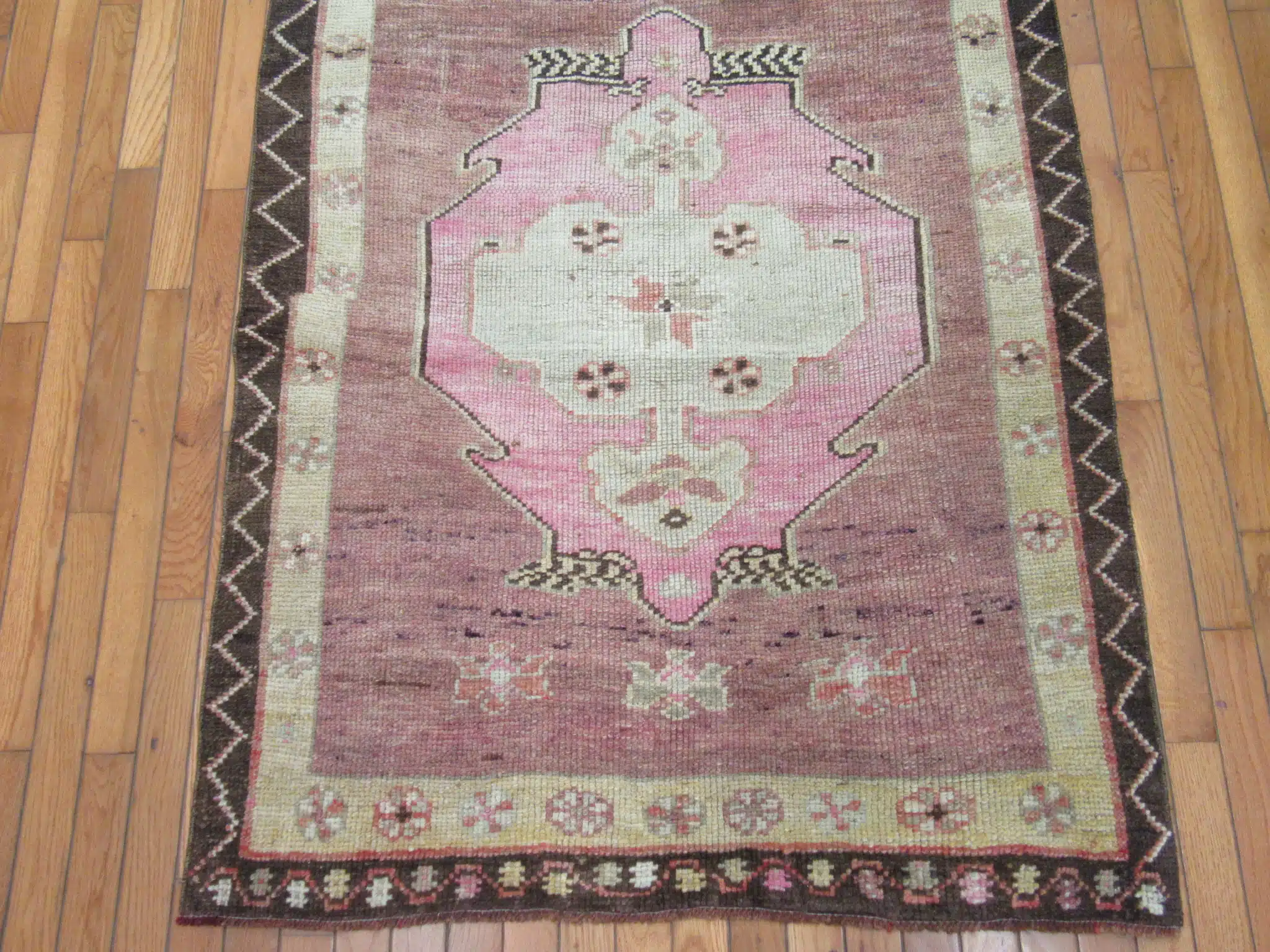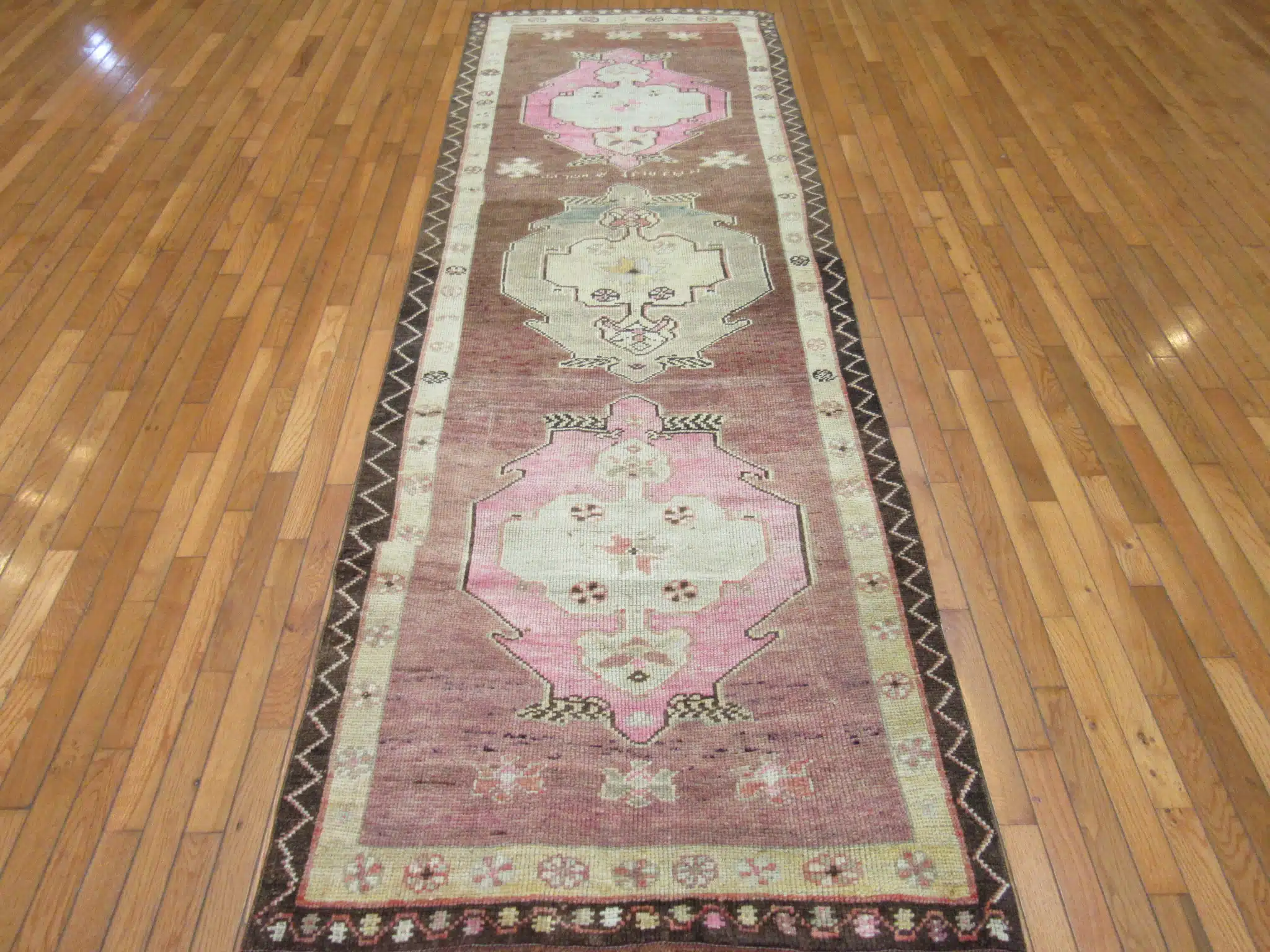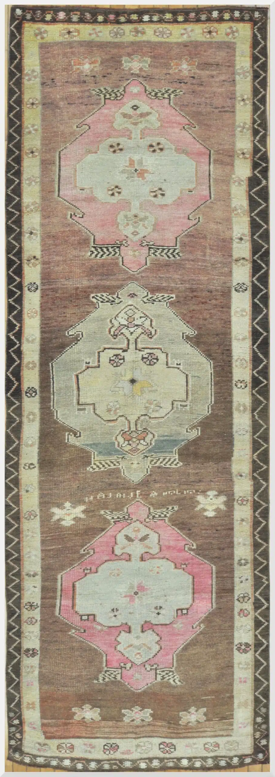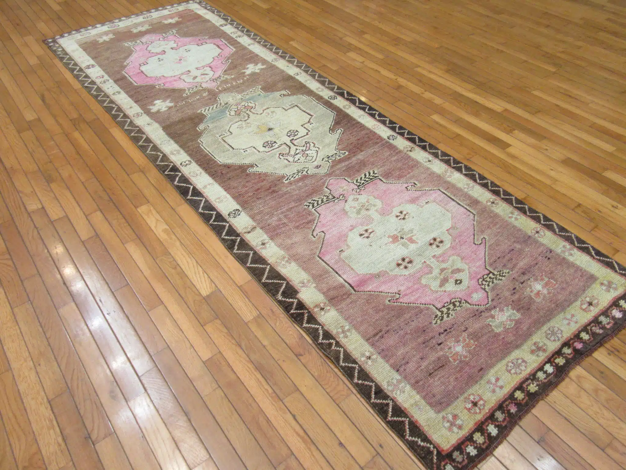 This authentic Turkish runner showcases a beautiful balance of earthy brown tones framed by delicate pink and ivory geometric medallions. The symmetrical layout reflects classic Anatolian craftsmanship, where precision knotting meets cultural storytelling through traditional motifs.