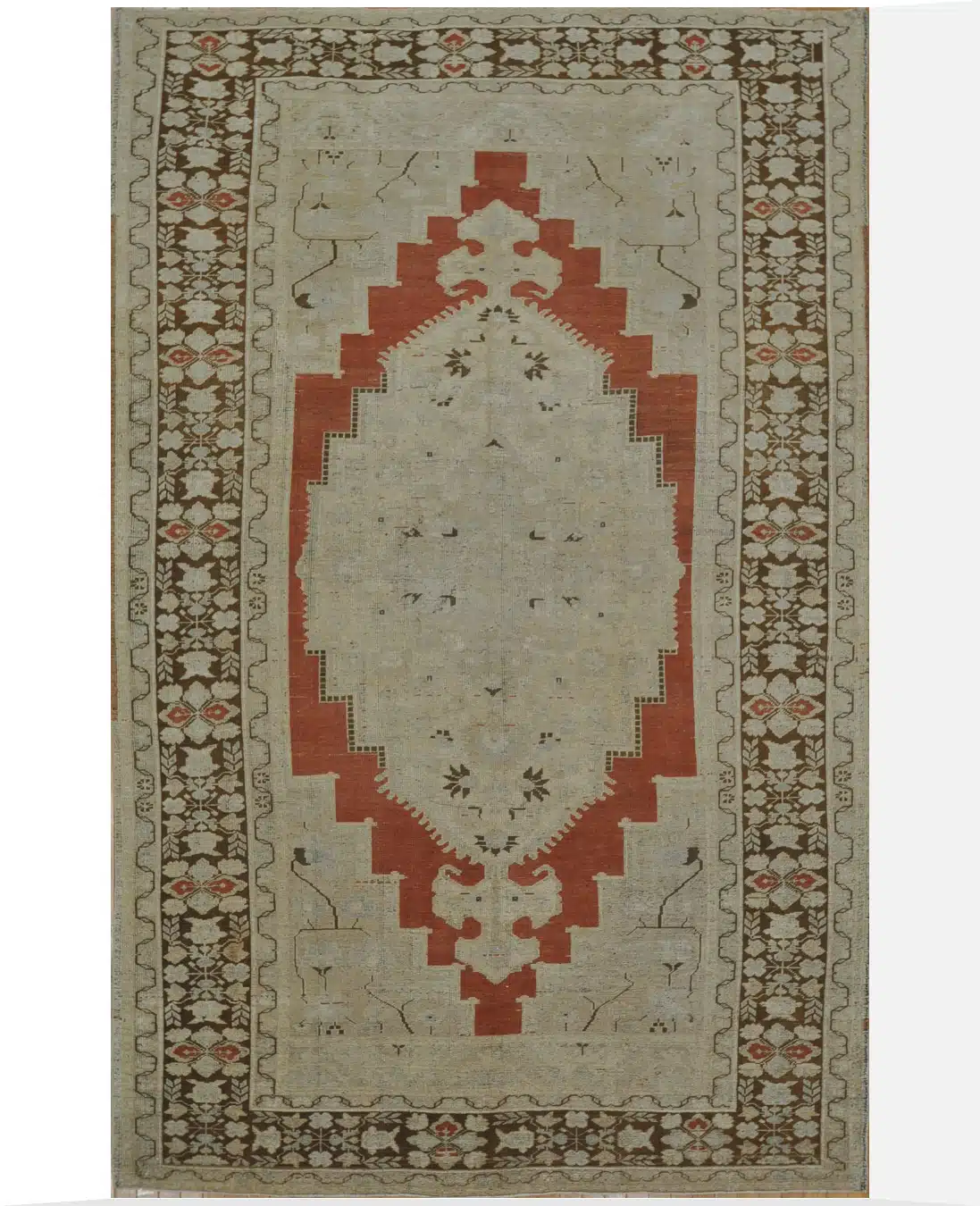 This vintage Turkish area rug in soft ivory showcases a striking terracotta red stepped central medallion with subtle floral details, framed by intricate geometric borders in coral, sage, and camel tones. Hand-knotted in wool, it offers a beautiful aged transitional style. See the long description for more details.