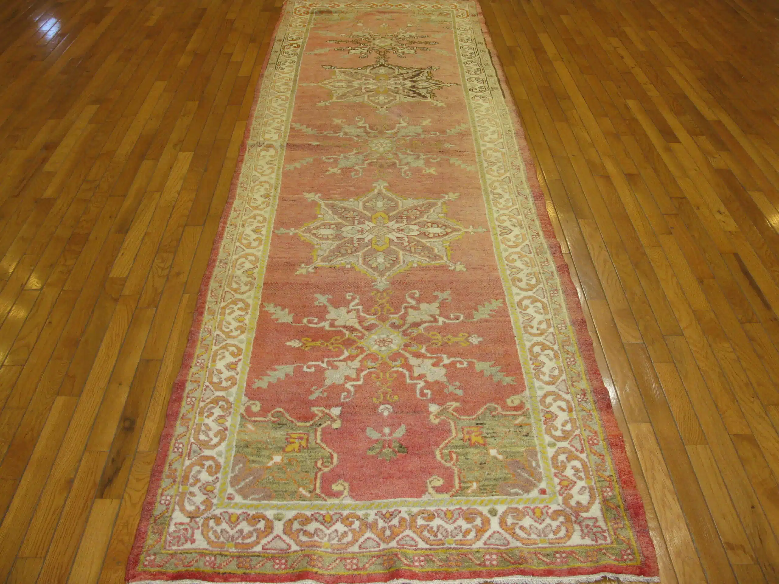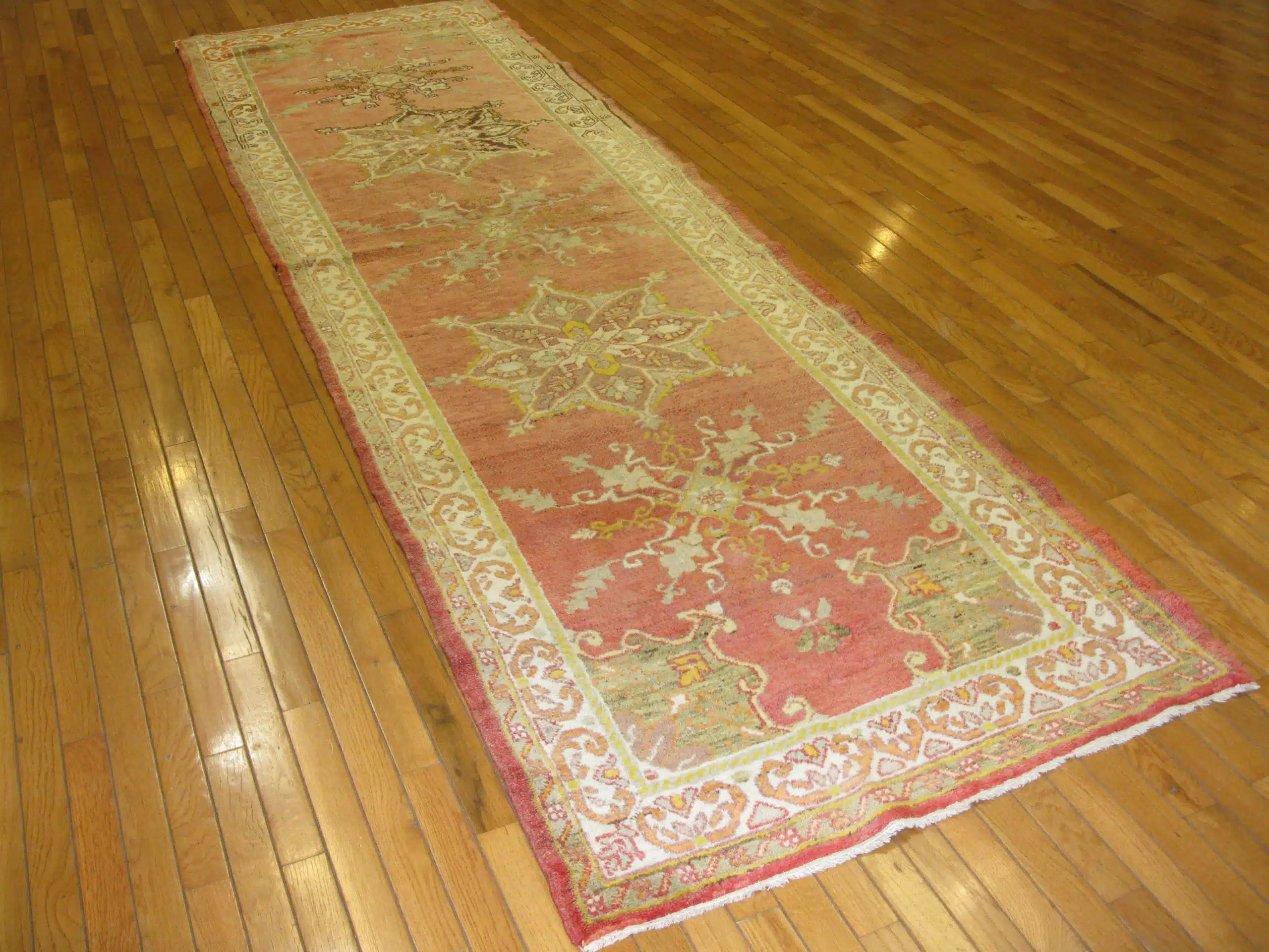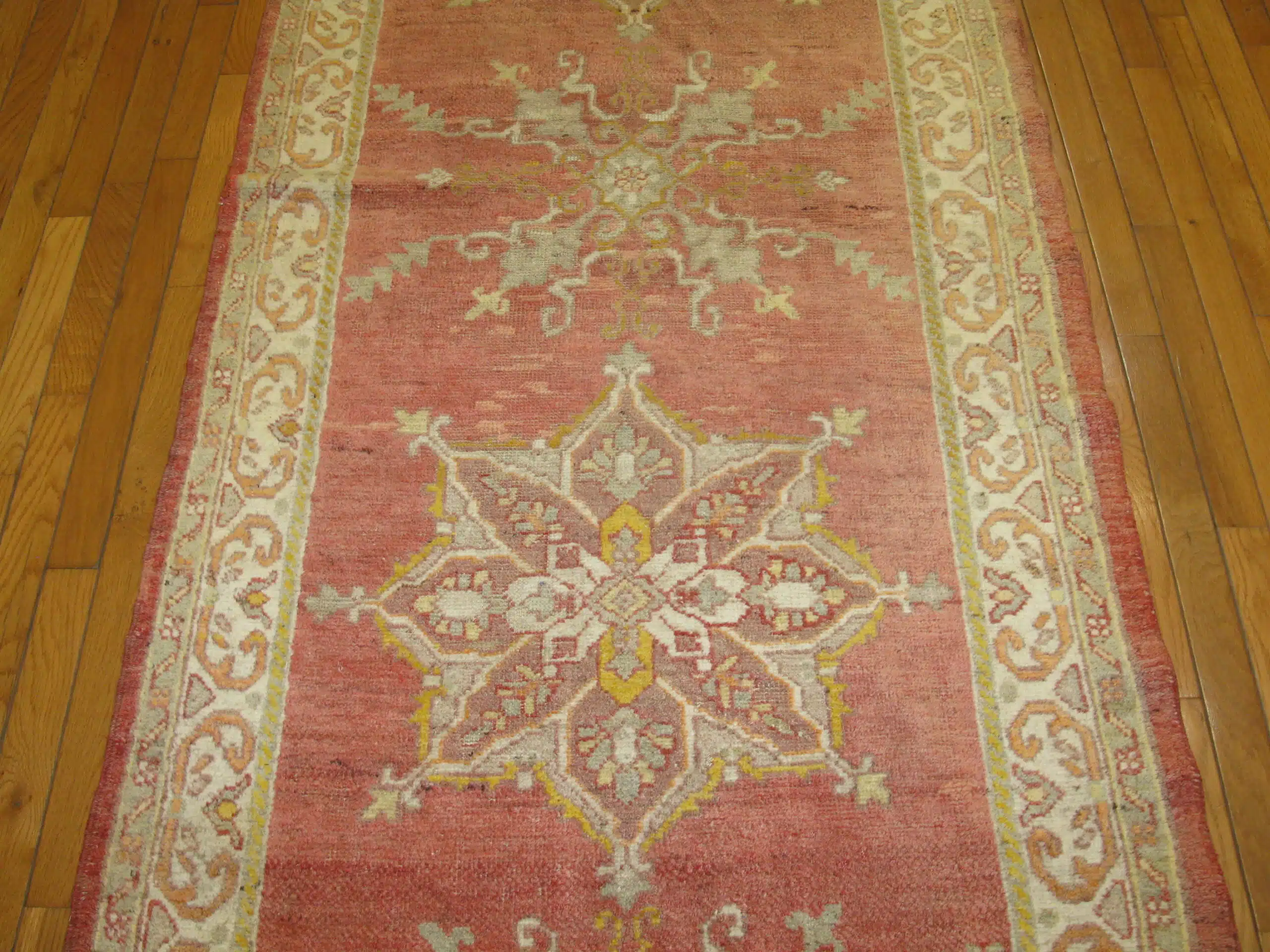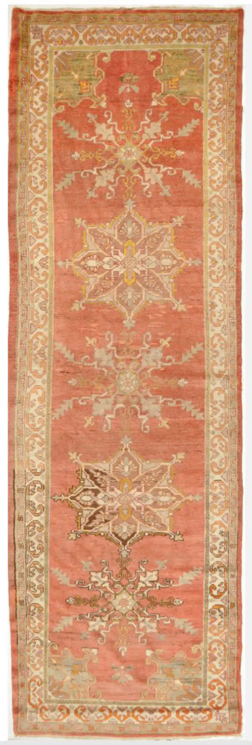 This vintage handmade Turkish Oushak runner features a soft melon-to-salmon field highlighted by elegant geometric medallions and delicate floral motifs. The ivory border with subtle green accents frames the design beautifully, creating a refined and airy visual balance.