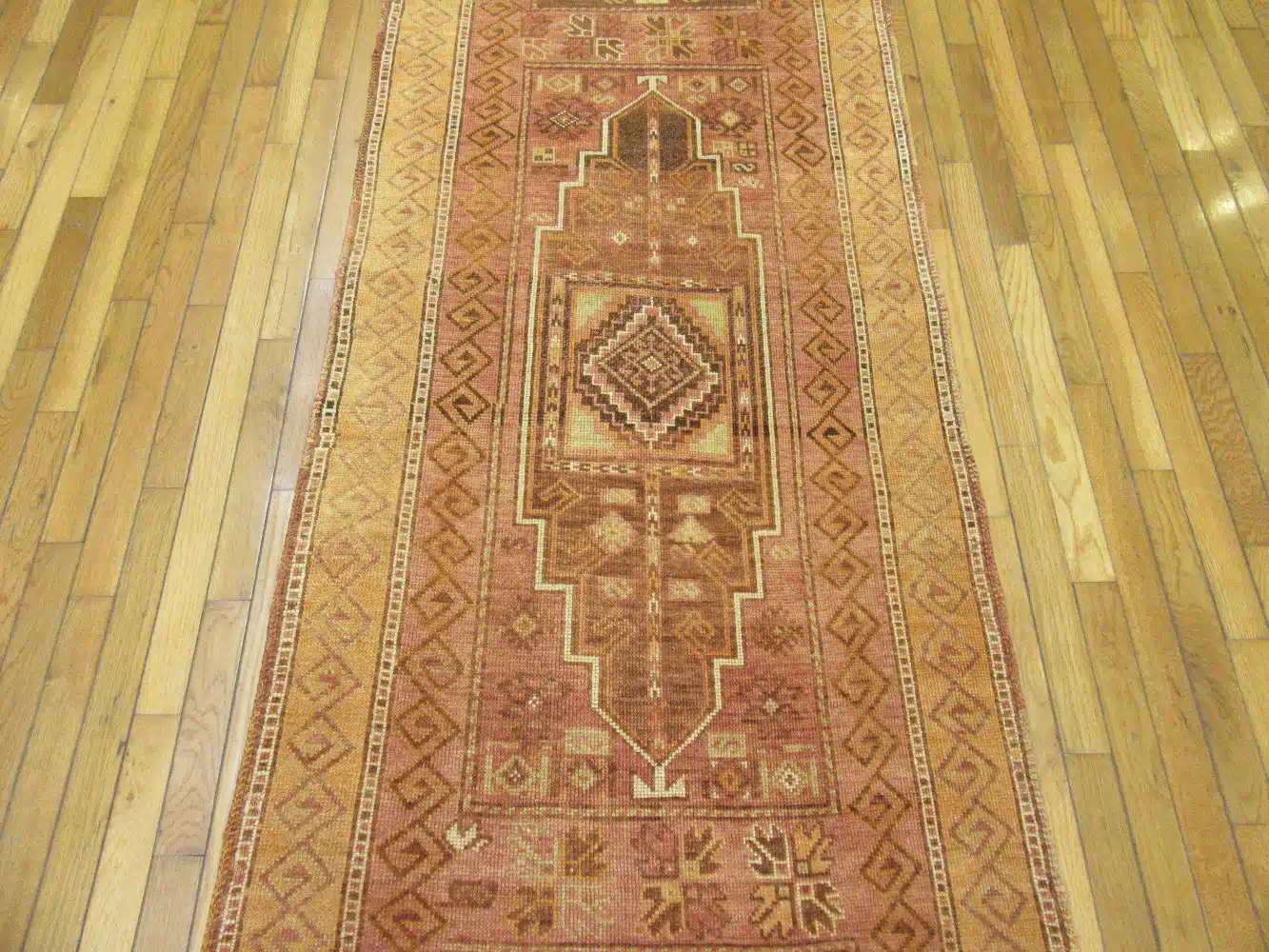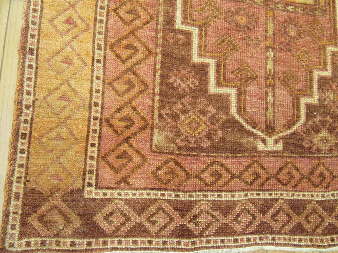 The dominant rust-brown field is beautifully softened by warm camel and tan accents, creating a grounded, earthy palette that feels both timeless and versatile. Subtle geometric symbols woven into the field reflect regional Anatolian design language, often associated with protection, continuity, and balance.