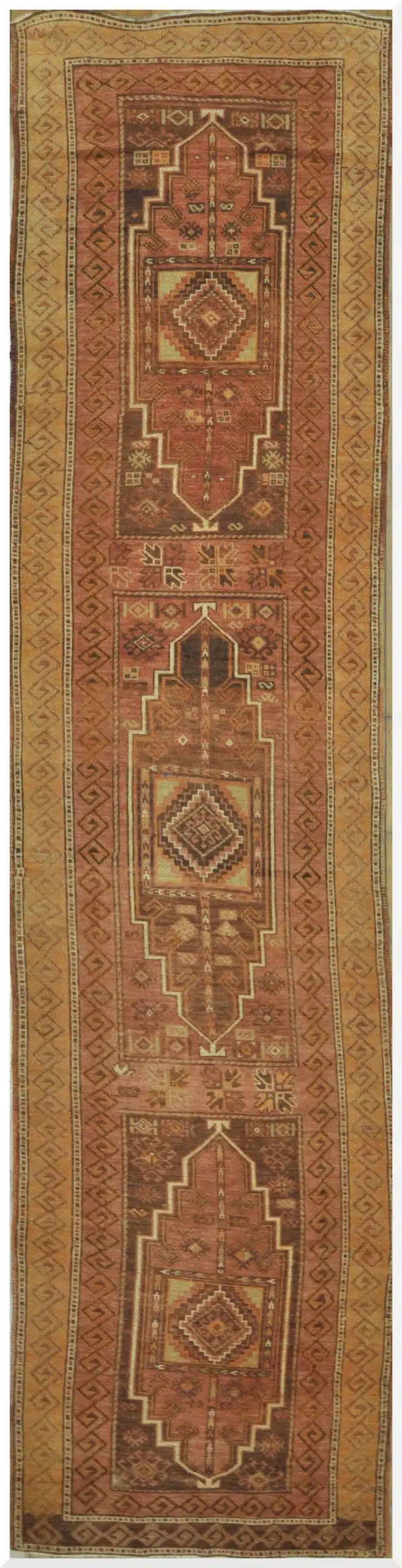 This vintage Turkish Anatolian runner features a bold yet balanced geometric composition rooted in traditional tribal weaving. The elongated format is centered around a stepped medallion motif, flanked by rhythmic geometric borders that emphasize movement and symmetry throughout the length of the rug.