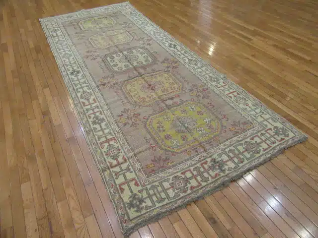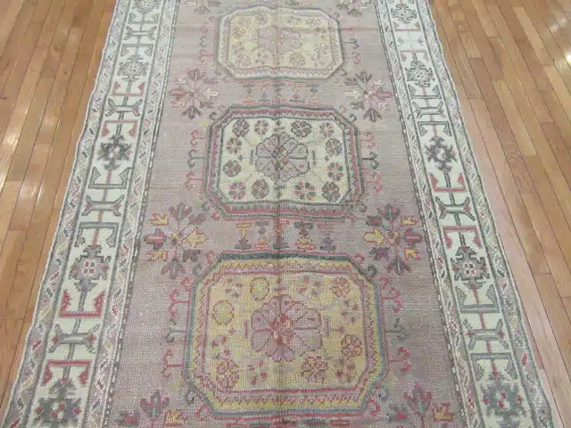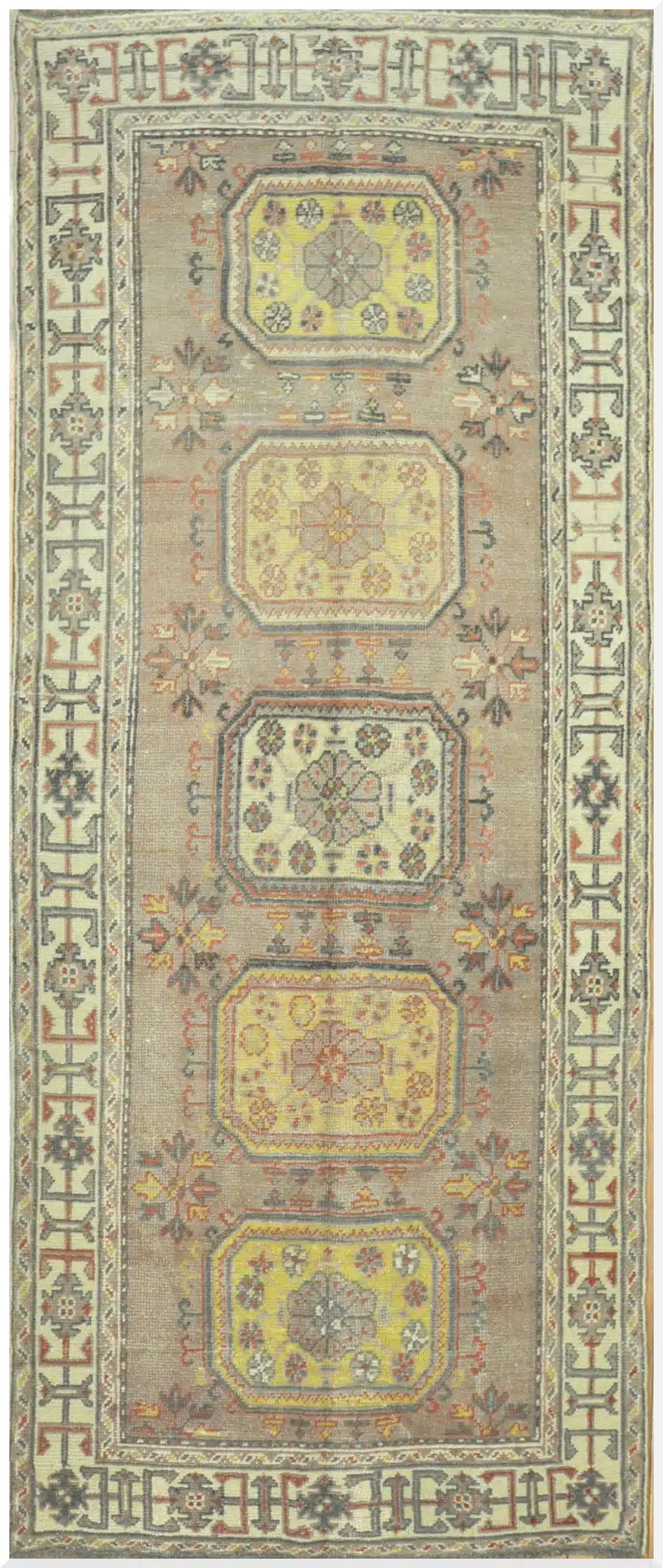 This vintage hand knotted Turkish runner features a refined geometric composition with a vertical arrangement of three framed medallions, a design often associated with Anatolian transitional weaving. The structured layout is softened by subtle detailing and gentle color transitions, giving the rug a balanced and approachable character.