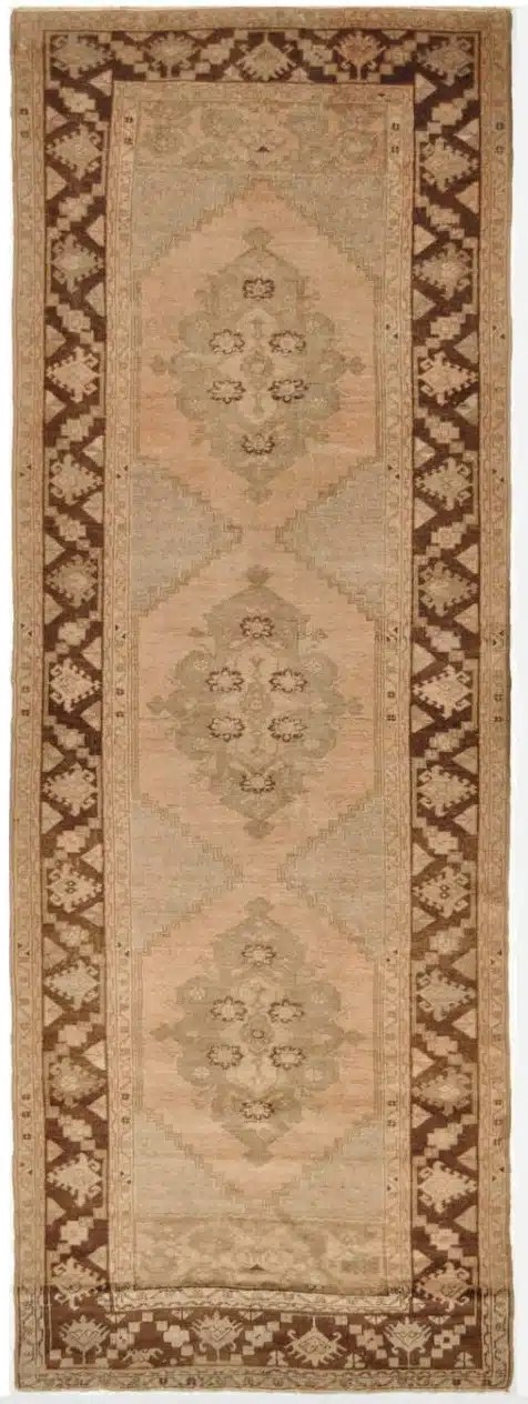 This vintage Turkish runner from around 1960 features a repeating elongated diamond medallion design with intricate floral and geometric centers in ivory and green, placed along the gentle pale pink field. The medallions are connected by smaller hooked motifs and vines that create a smooth vertical flow suited to long spaces. Wide multiple borders include repeating stylized flowers, diamond chains, and geometric guards in rich brown and cream, framing the runner with balanced elegance and soft age-related fading.