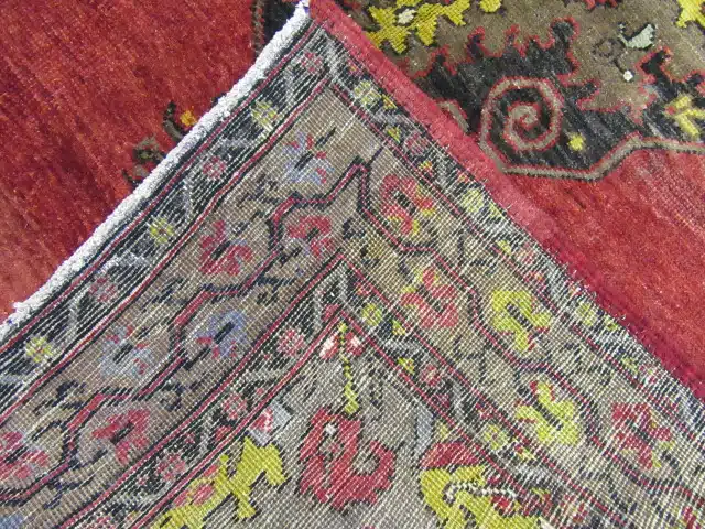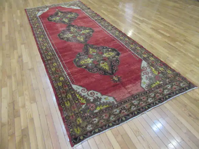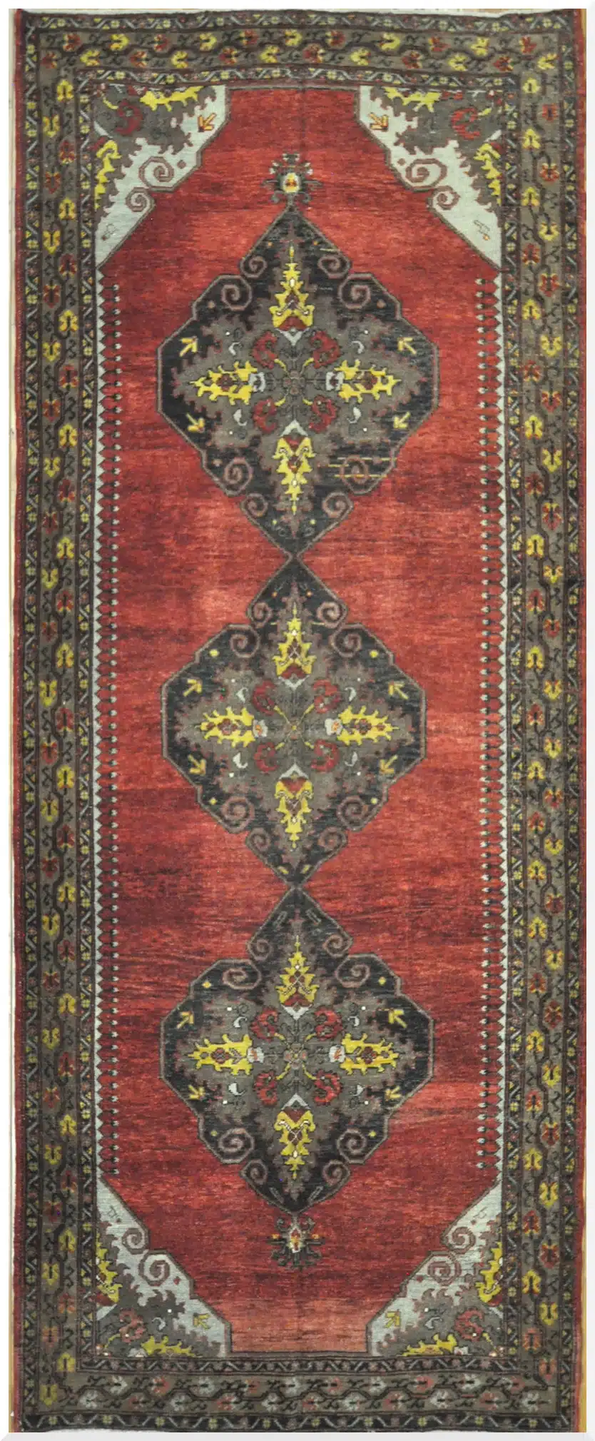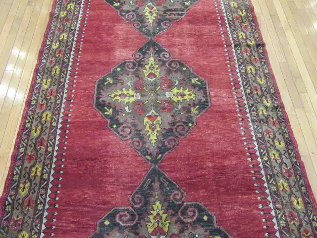 This vintage hand-knotted Turkish rug from Central Anatolia showcases a bold triple medallion composition set against a rich brick red field. The strong geometric medallions are framed by a detailed border, reflecting the tribal artistry and symbolism characteristic of Anatolian weaving traditions.