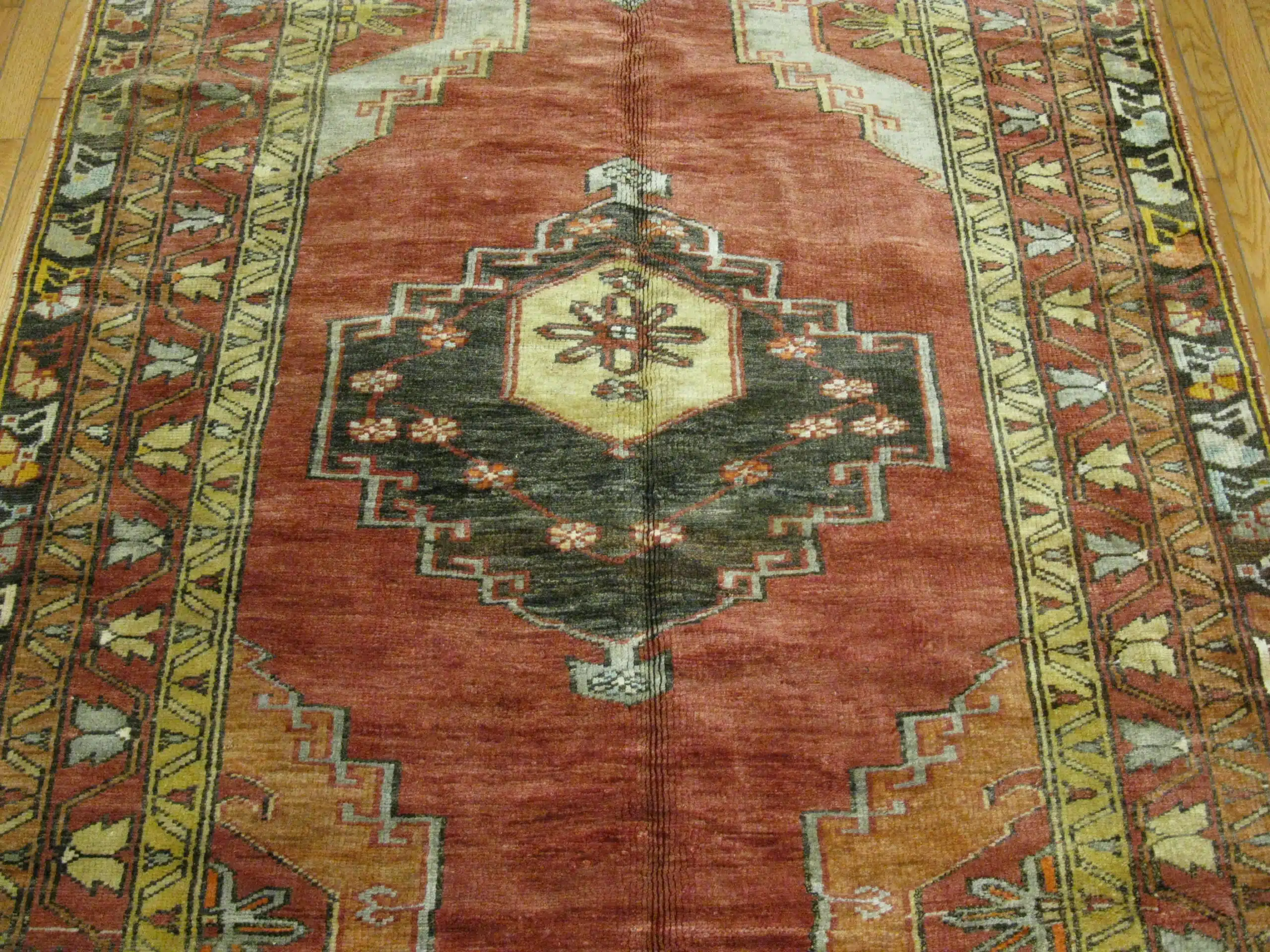 The symmetrical layout and angular design elements reflect traditional Anatolian weaving traditions, where bold geometry and symbolic forms were used to create visual balance and cultural meaning. Subtle abrash throughout the field enhances the rug’s depth and authenticity, showcasing the natural character of hand-dyed wool.