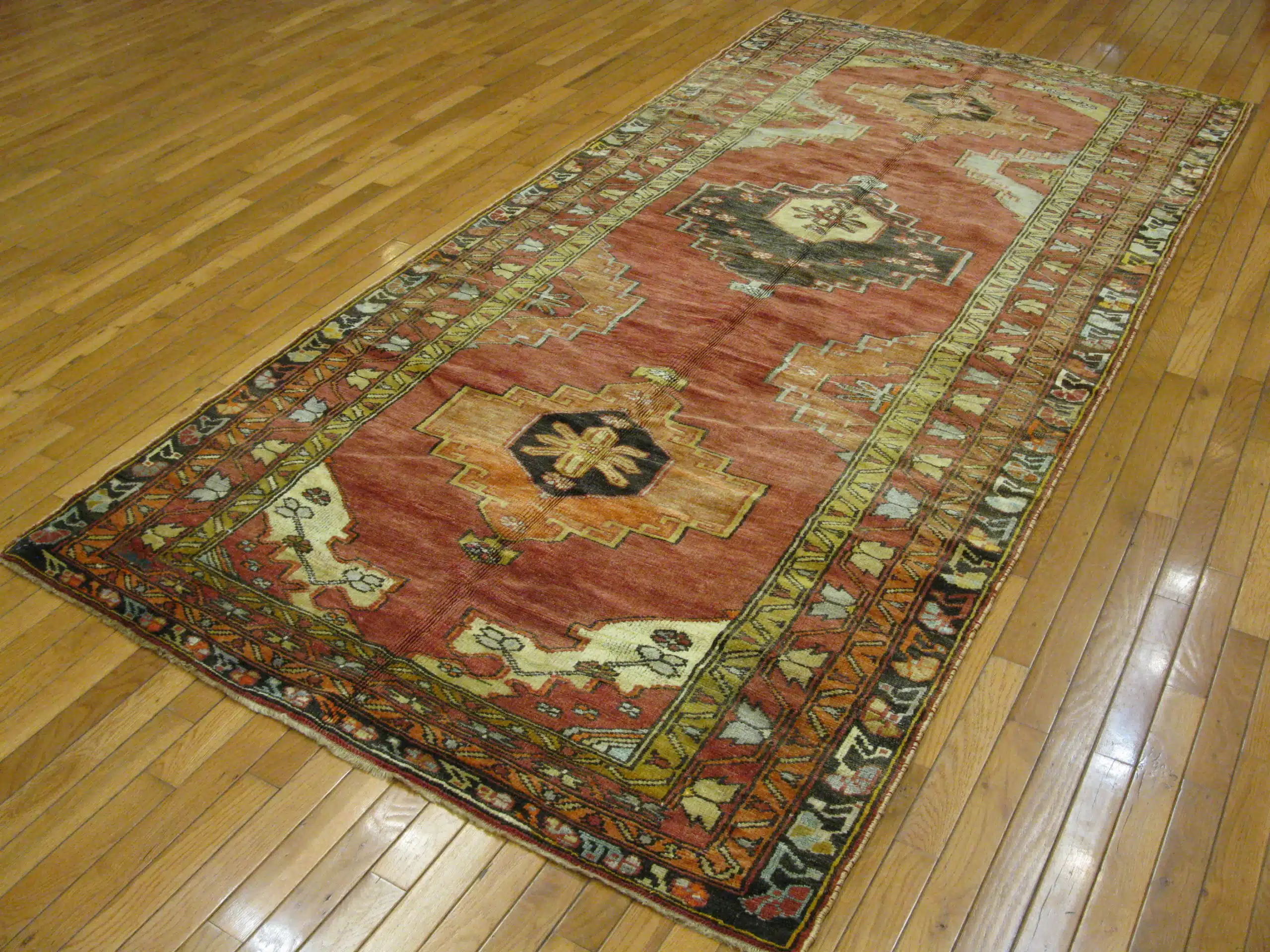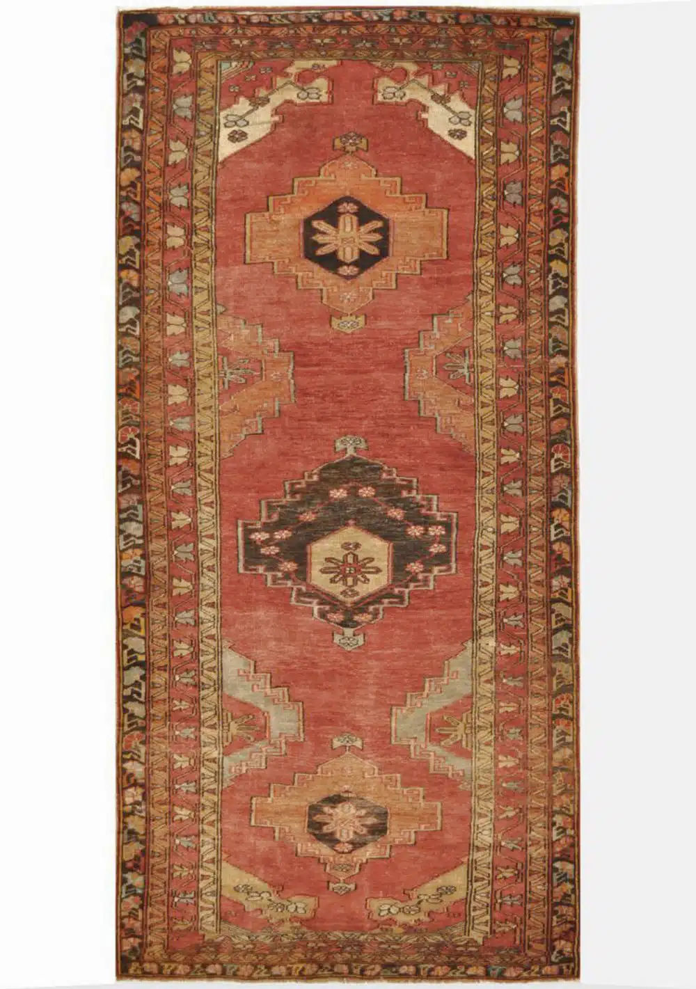 This vintage wide runner originates from the Anatolian region of Turkey and features a classic geometric composition presented in an elongated gallery format. The dominant brick red field provides a warm and grounding presence, accented by stepped medallions and tribal motifs rendered in soft gold, charcoal, and ivory tones.