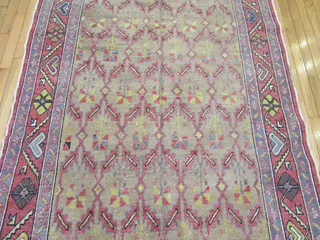 This vintage Turkish rug features a refined all-over geometric pattern arranged in a delicate, repeating lattice design. The composition creates a calm, rhythmic visual flow that feels balanced and understated, making it highly versatile for a wide range of interiors.