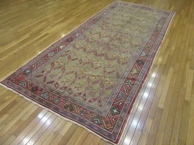 The soft sage-green field serves as a gentle foundation for the subtle accents of coral, pale yellow, dusty blue, and faded rose. These colors are intentionally muted, giving the rug a naturally aged appearance while maintaining clarity and definition throughout the pattern.