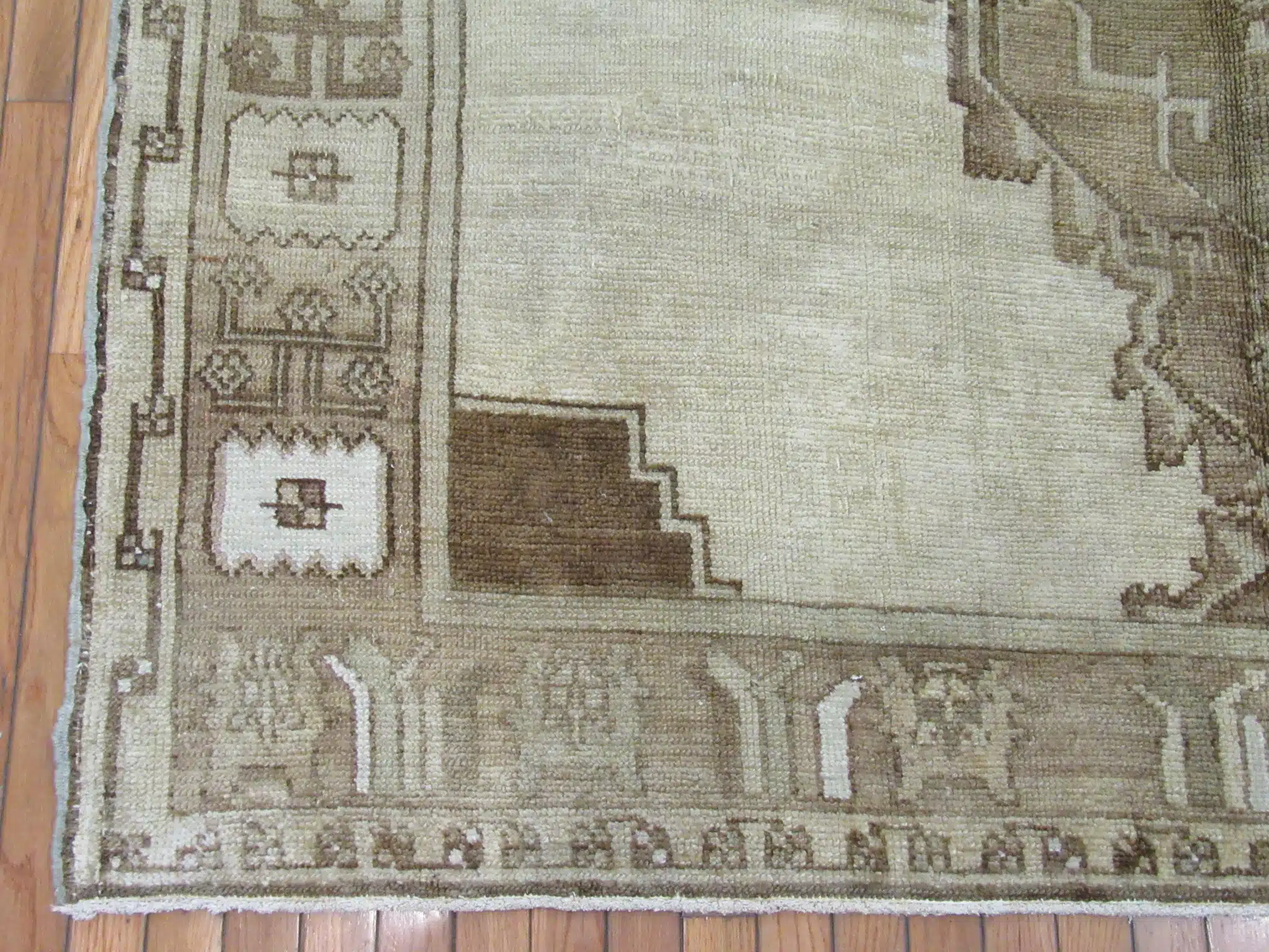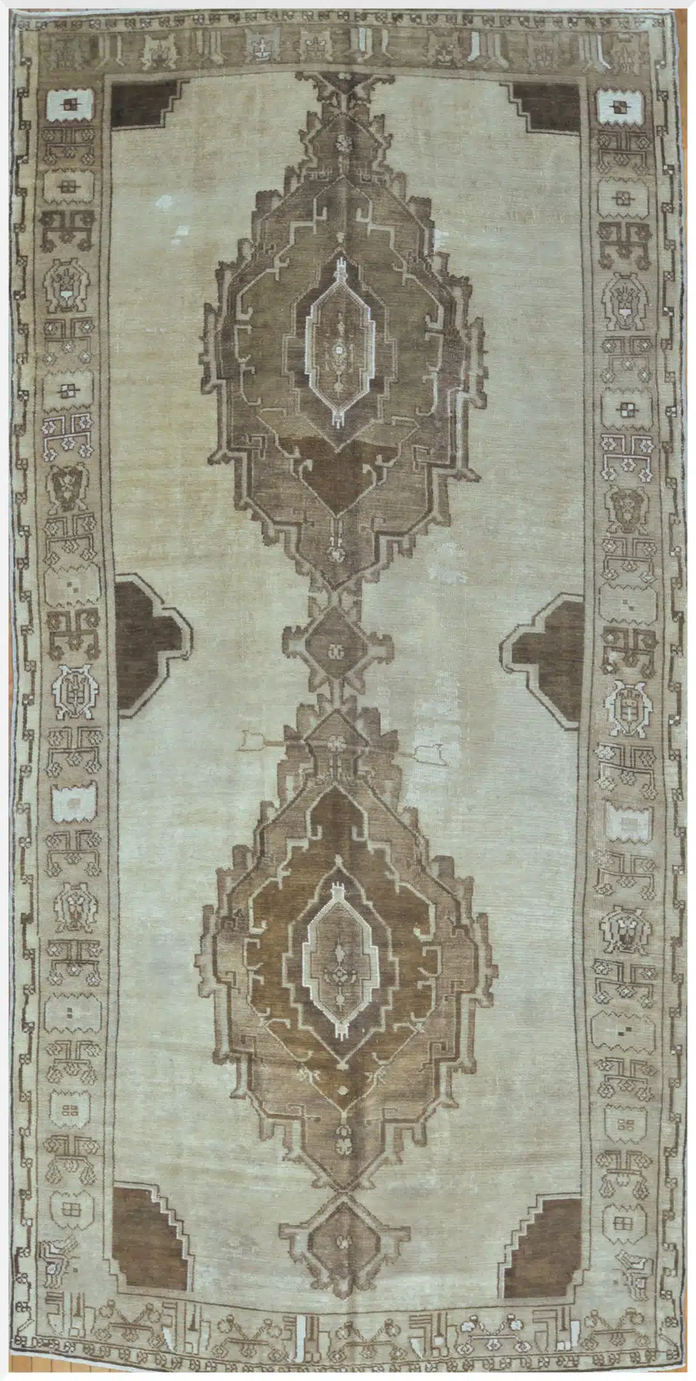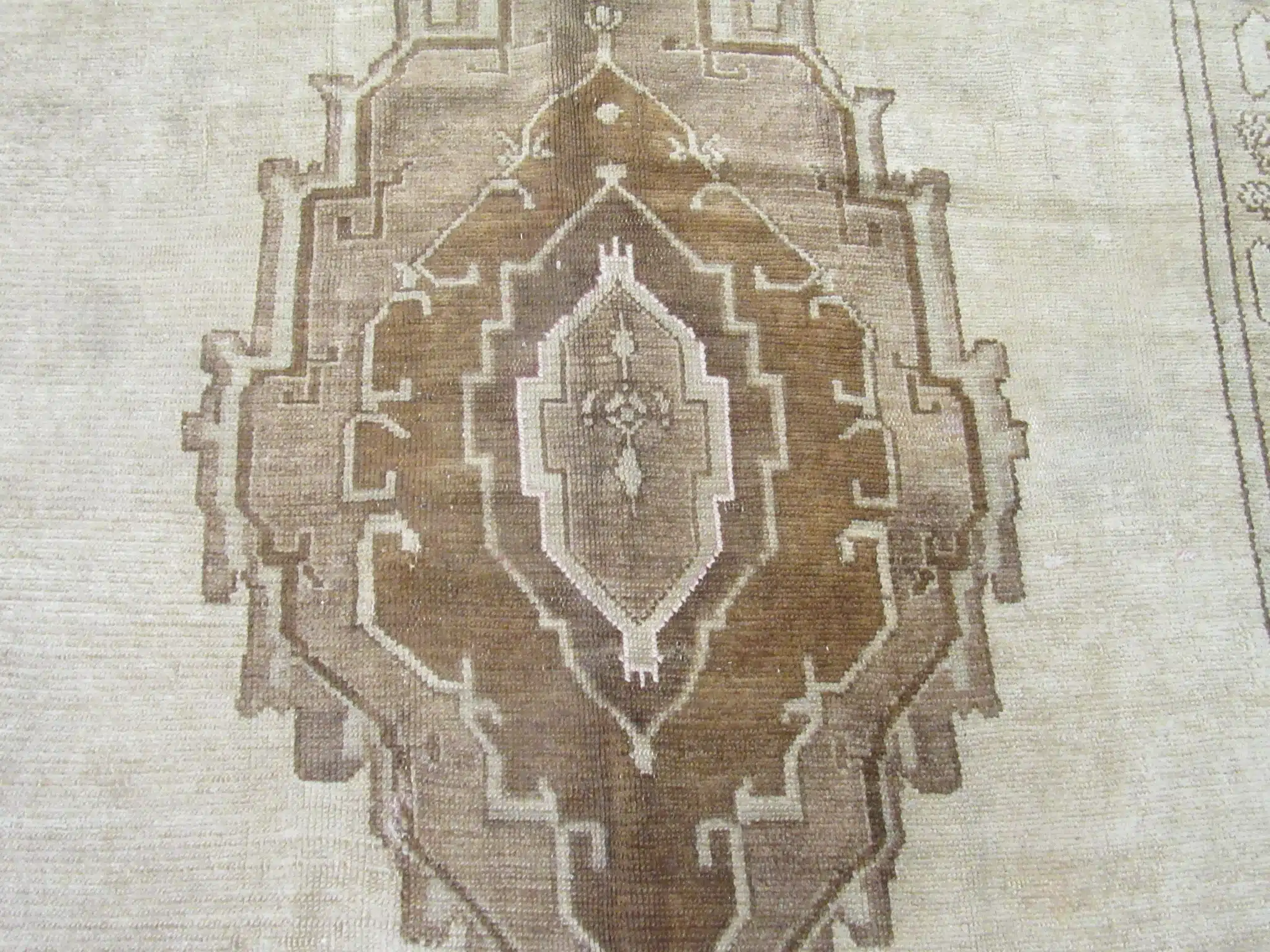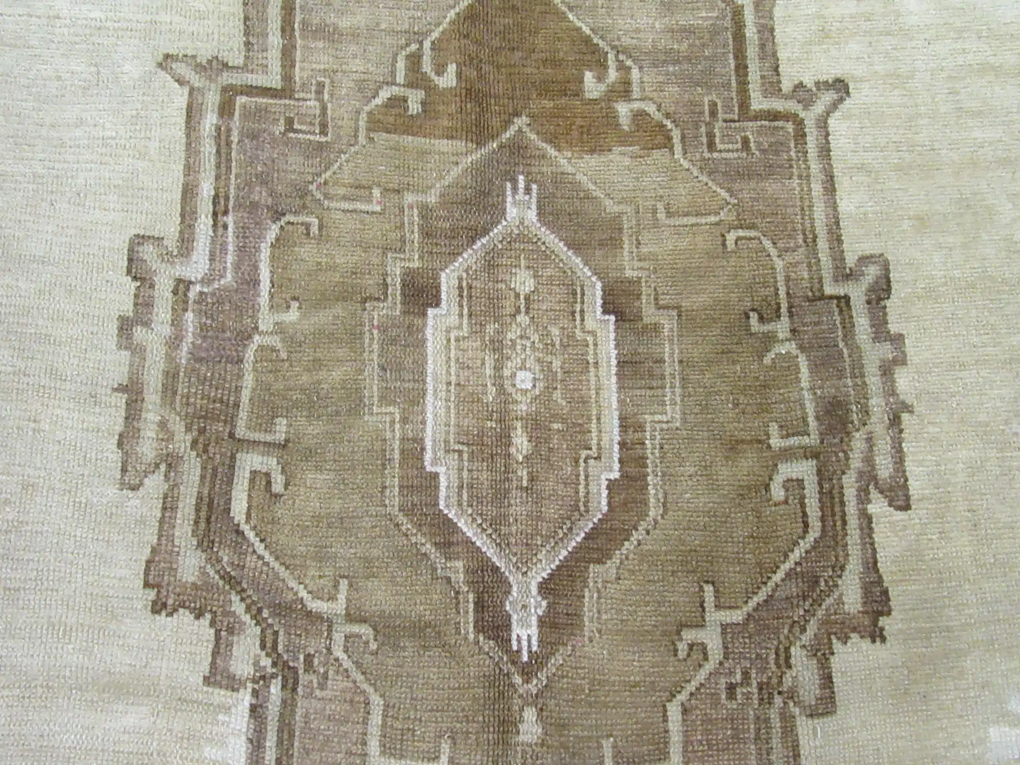 This is a vintage hand knotted antique washed gallery size Turkish Anatolian rug. It is made with wool on cotton foundation. It has a simple geometric design in neutral colors. An easy rug to work with.