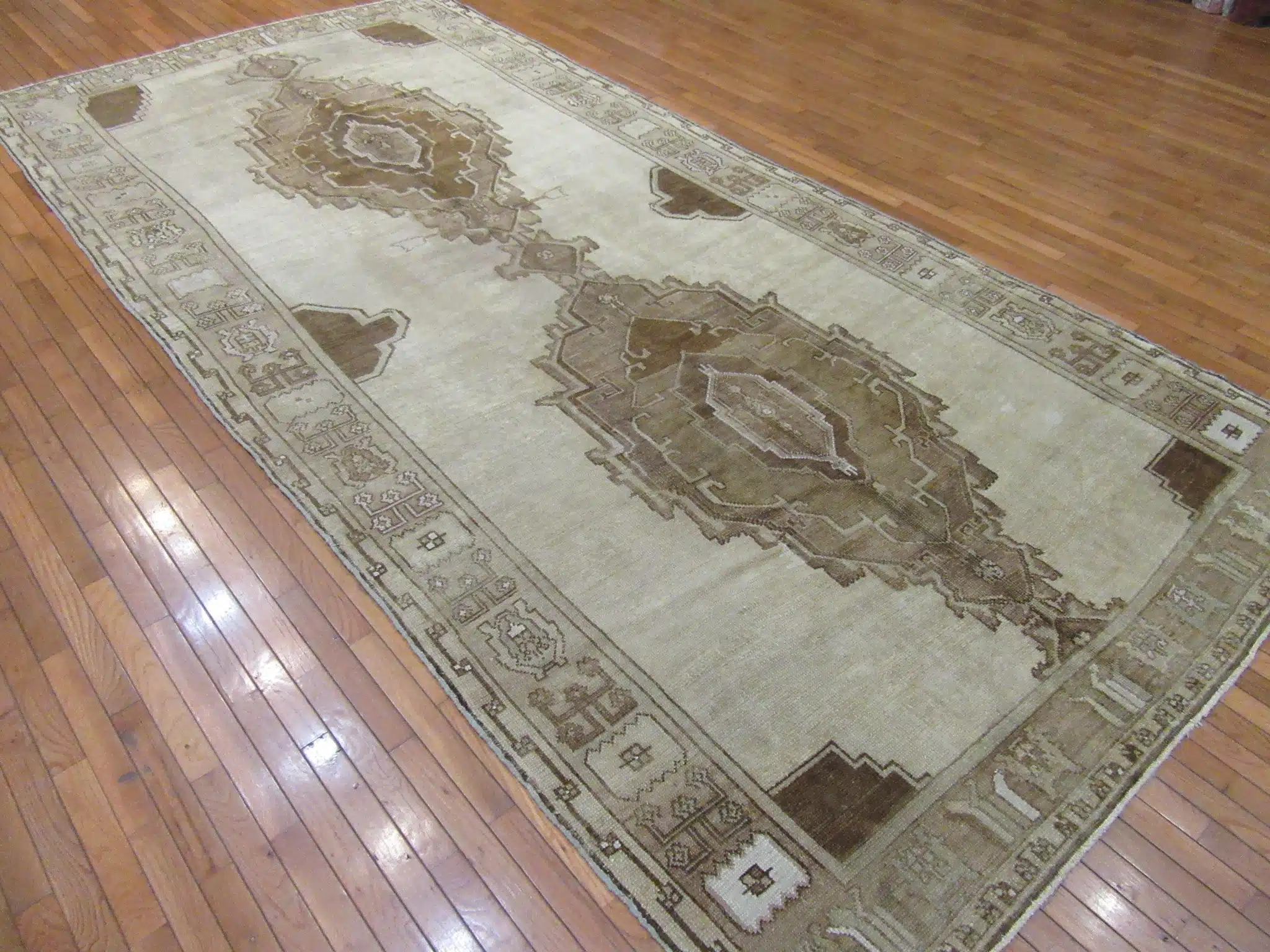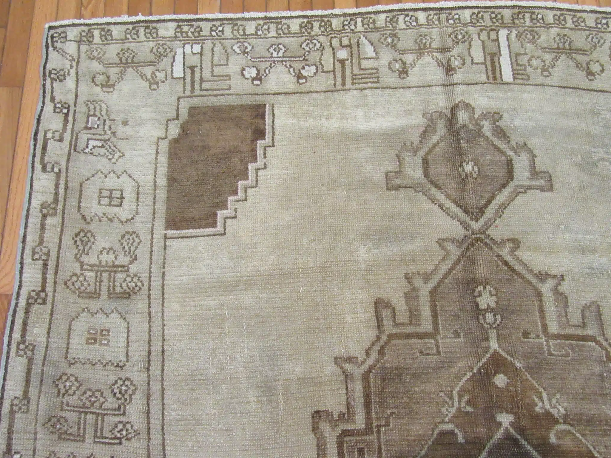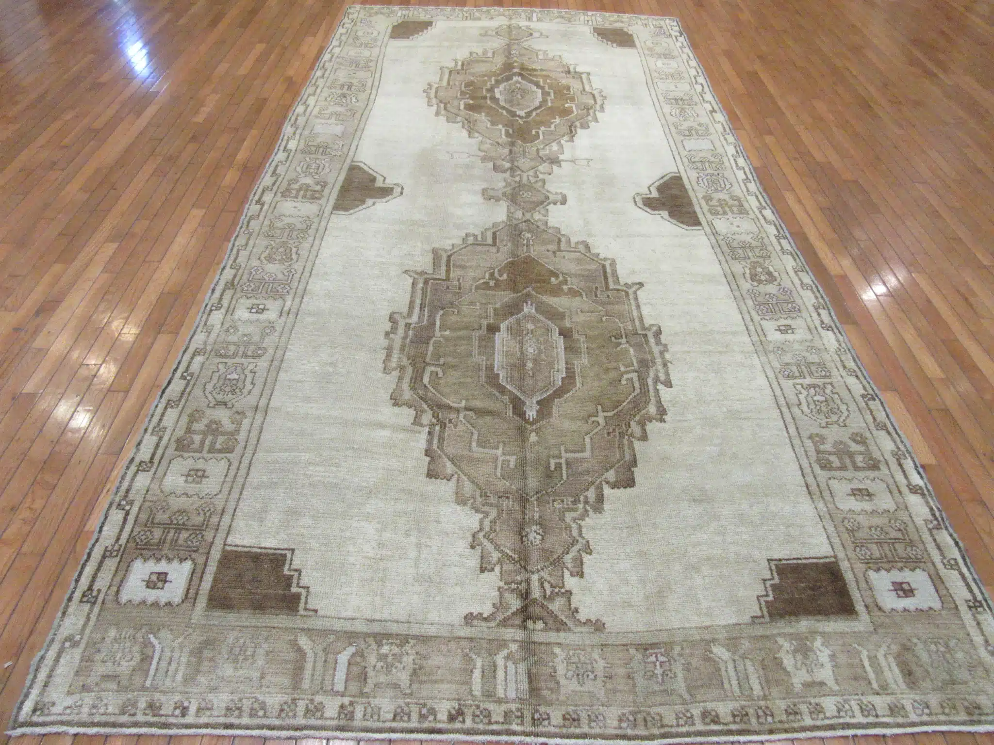 This is a vintage hand knotted antique washed gallery size Turkish Anatolian rug. It is made with wool on cotton foundation. It has a simple geometric design in neutral colors. An easy rug to work with.