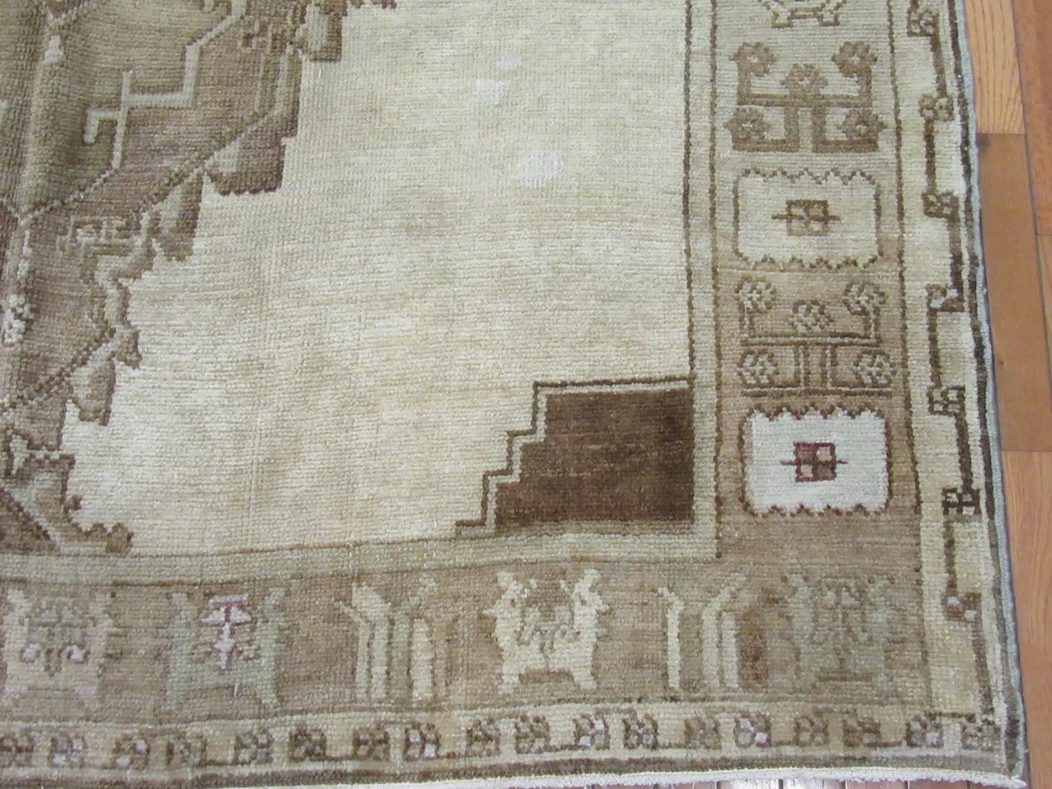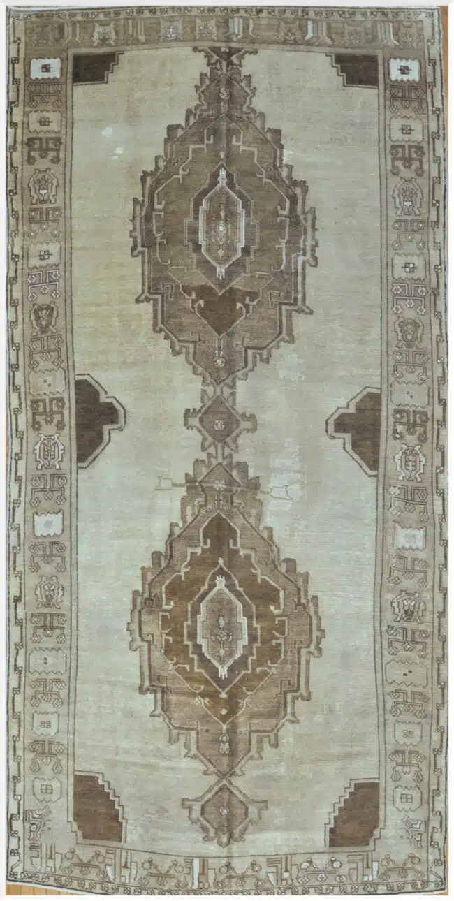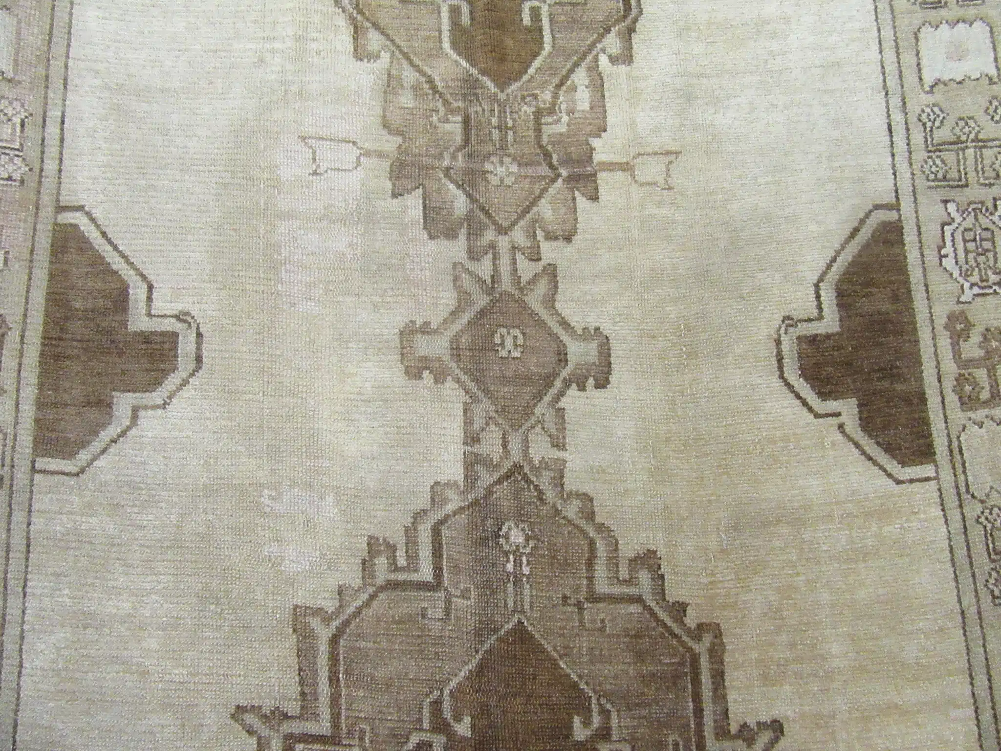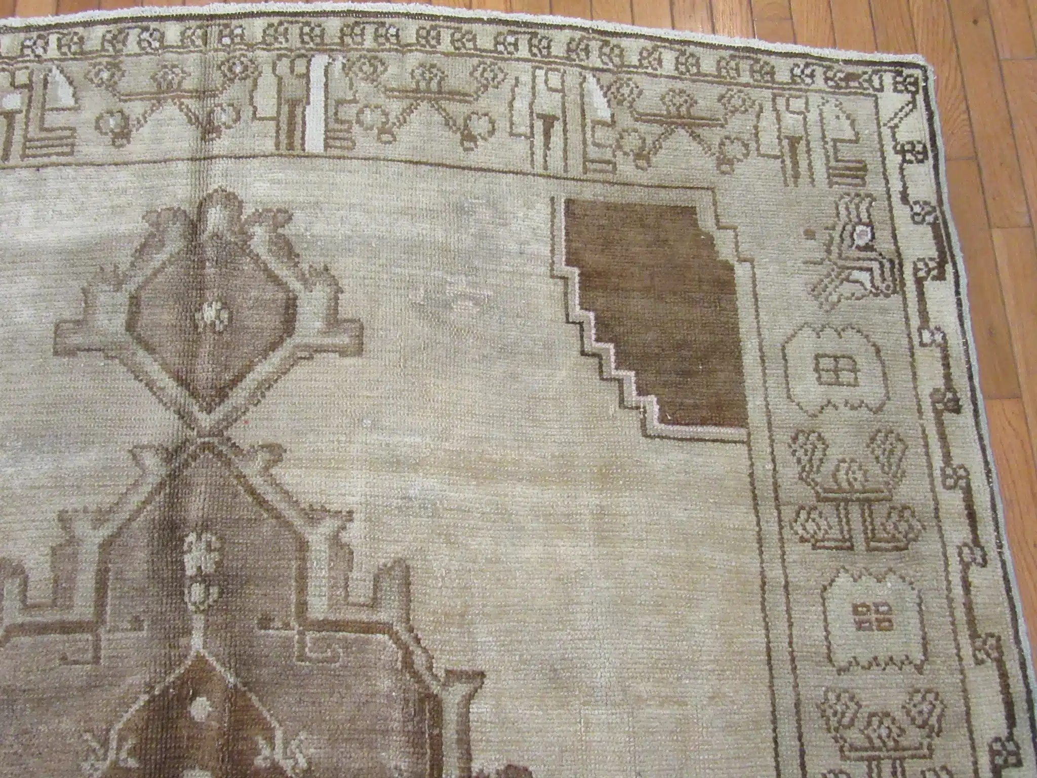 This is a vintage hand knotted antique washed gallery size Turkish Anatolian rug. It is made with wool on cotton foundation. It has a simple geometric design in neutral colors. An easy rug to work with.