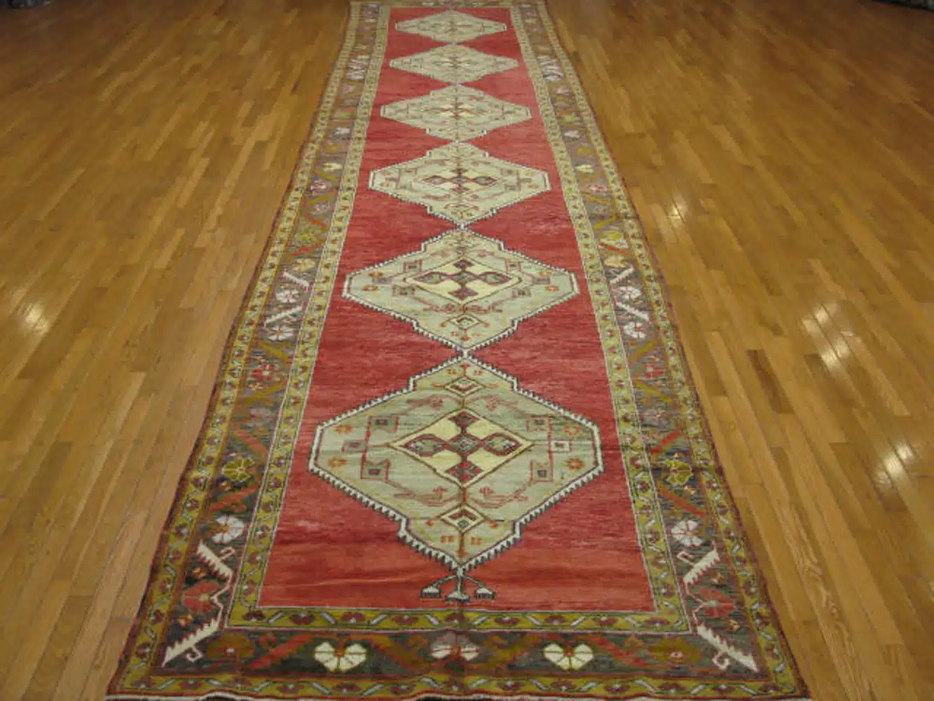 This vintage handmade Turkish runner features a bold sequence of geometric diamond medallions aligned vertically along a rich brick red field. Each medallion is framed with soft sage green and ivory accents, creating strong contrast and visual movement throughout the length of the rug.