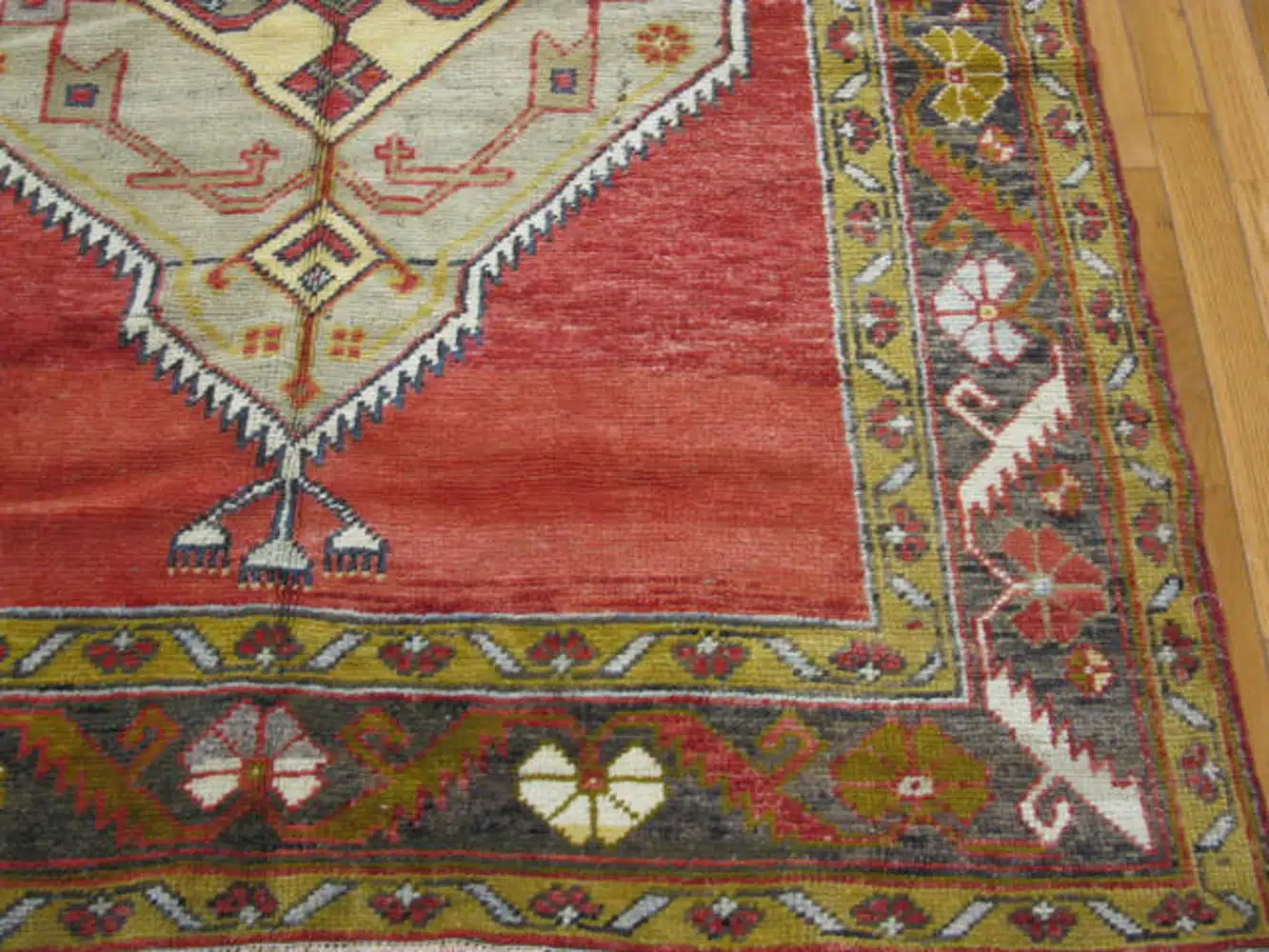 Hand knotted in Anatolia using high-quality wool, the rug reflects traditional tribal weaving influences with stylized motifs and a finely detailed border. The balanced composition and repeating medallion layout give the piece a refined transitional character while preserving its authentic heritage.