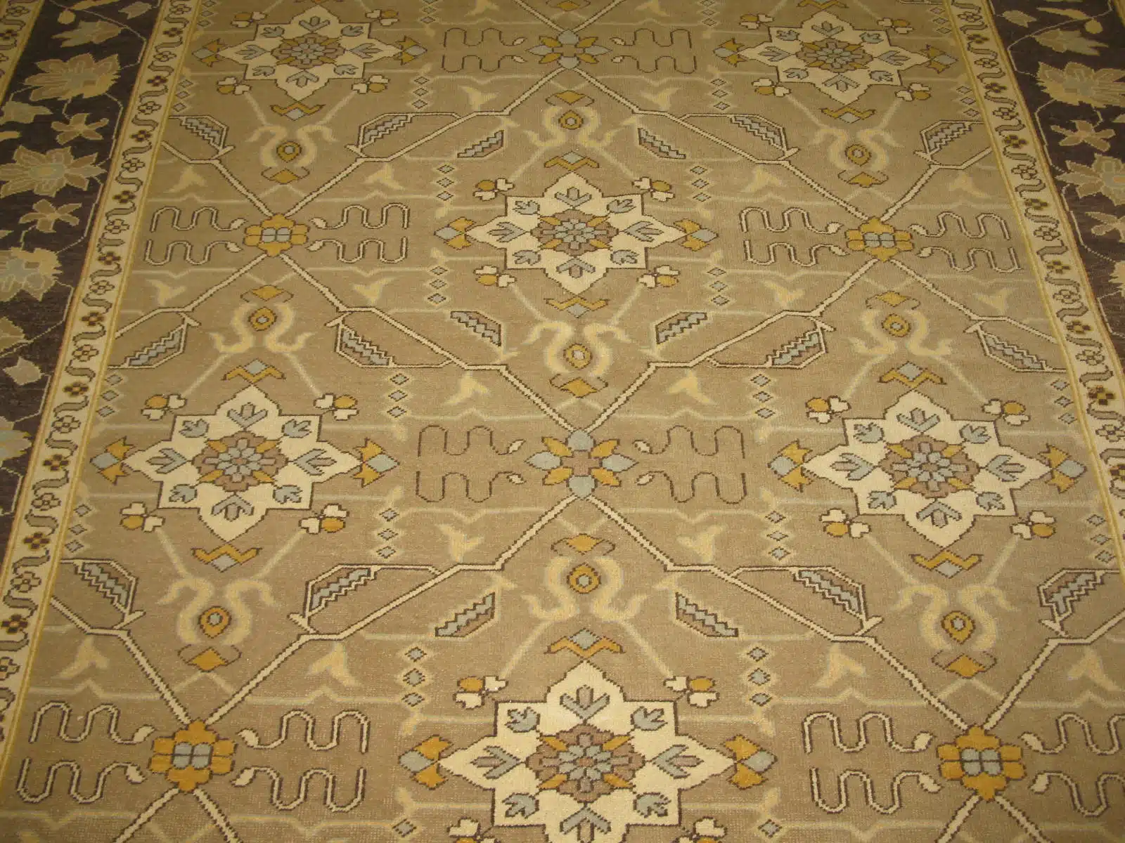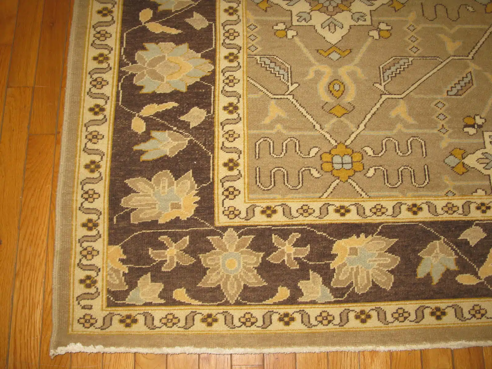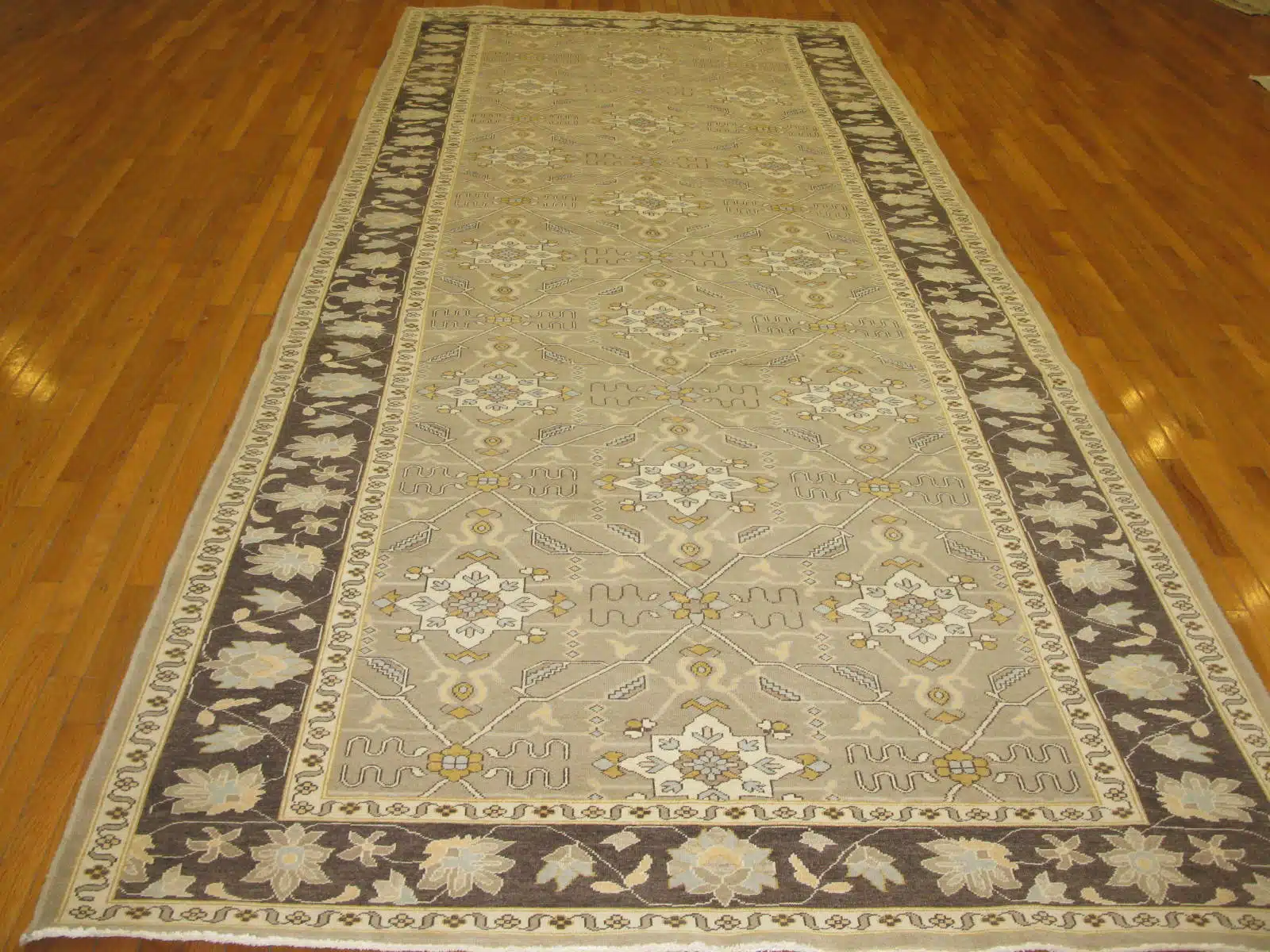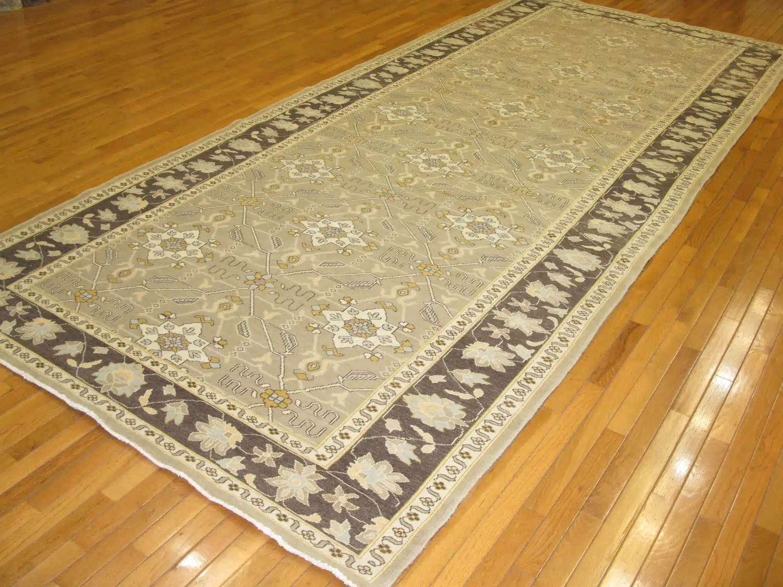 This new Egyptian Agra runner features a graceful all-over floral pattern with symmetrical elegance. Delicate scrolling vines, large palmettes, and soft blossoms in coral and blue tones spread evenly across the beige field, creating a refined and flowing design suited for narrow spaces. The wide borders include repeating floral chains and geometric motifs that frame the piece with classic balance.