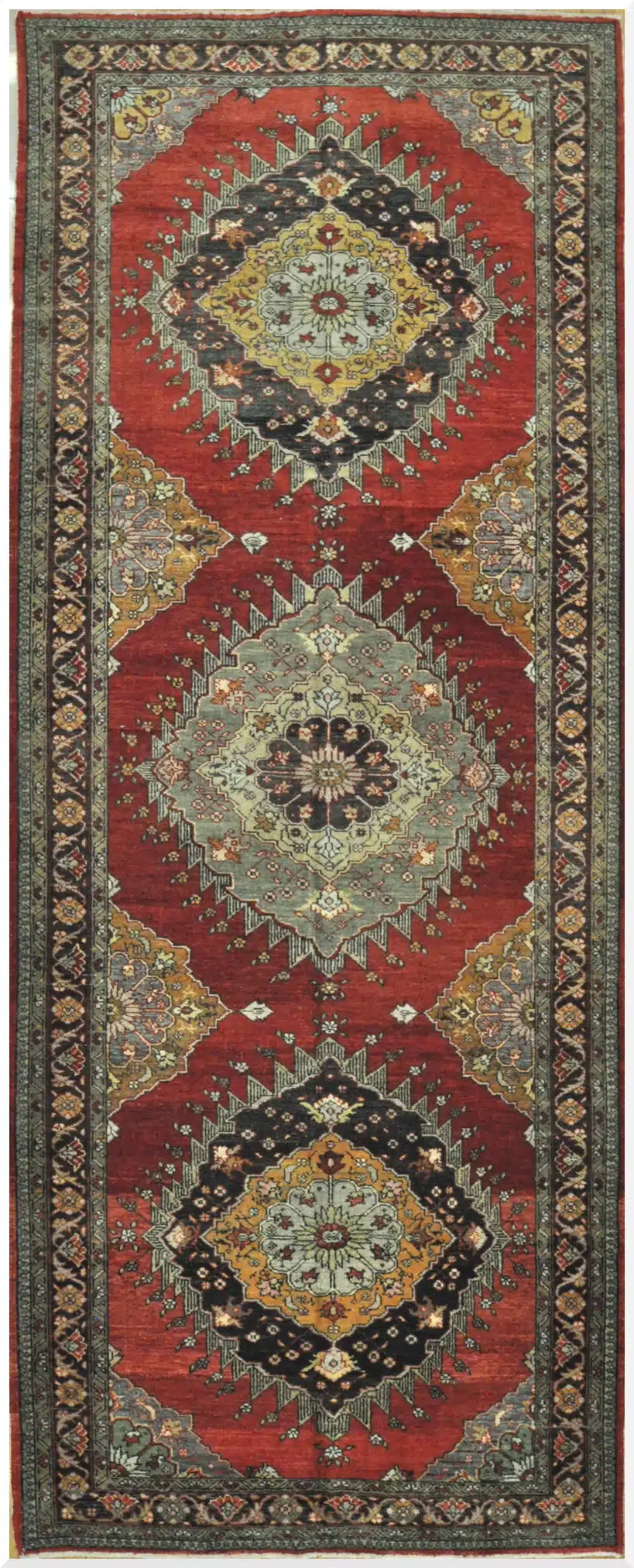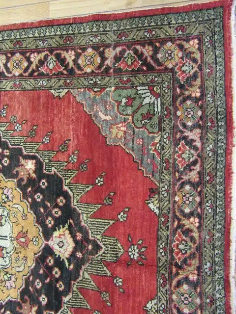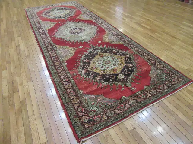 This vintage hand-knotted Turkish rug features a bold triple medallion design set against a rich brick red field, framed by intricate floral and geometric borders. Woven in Central Anatolia, this piece reflects the region’s strong tribal heritage and time-honored weaving traditions.